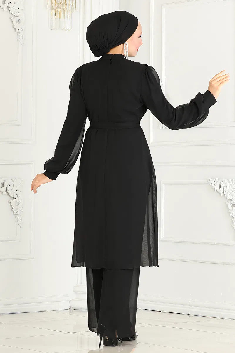 Göğsü Taş Detaylı Şifon Kombin Siyah