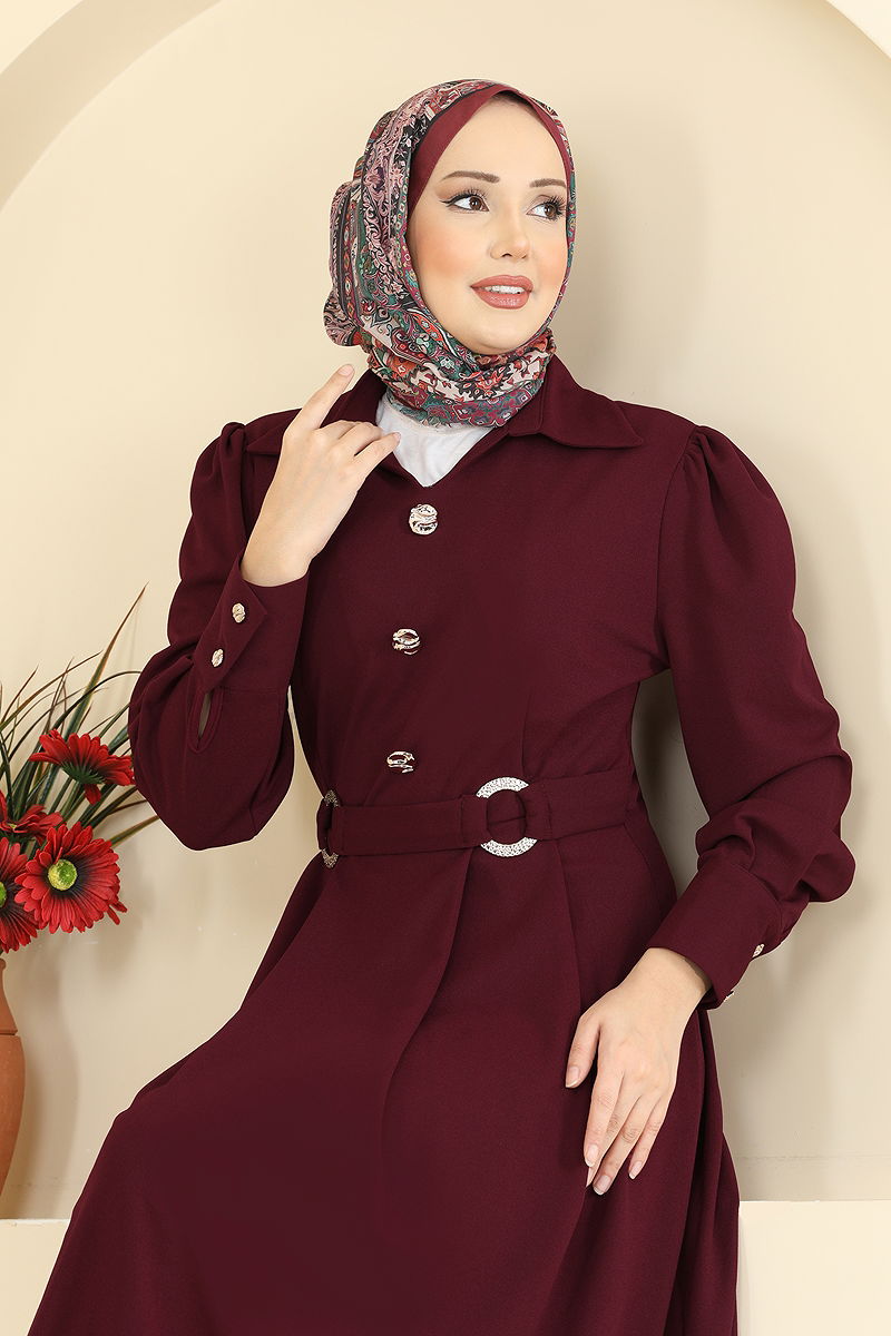 Gold Düğmeli Elbise 5370AL357 Bordo
