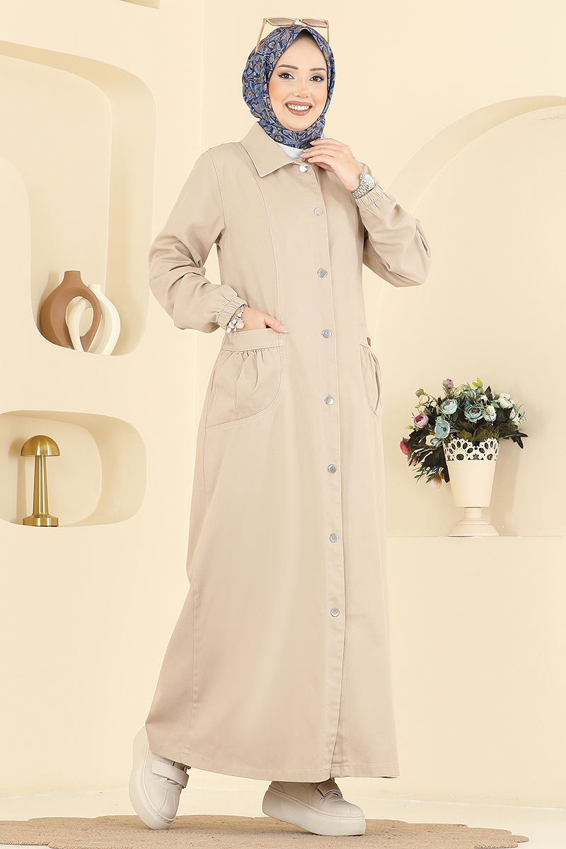 Gömlek Yaka Armalı Kap, KAP modeli olarak tasarlanmış bir tesettür giysisidir. Dört mevsim boyunca rahatça kullanabilirsiniz. 30 derecede hassas ayarında yıkanabilen bu ürün, gömlek yaka tasarıma sahiptir ve önden düğmeli olarak tasarlanmıştır. Astarsız yapısı ile hafif ve rahat bir kullanım sunar. Üzerinde şık bir arma detayı bulunur ve pratik kullanım için cepli ve manşetleri lastiklidir. Modelin üzerindeki ürün 38 bedendir.
