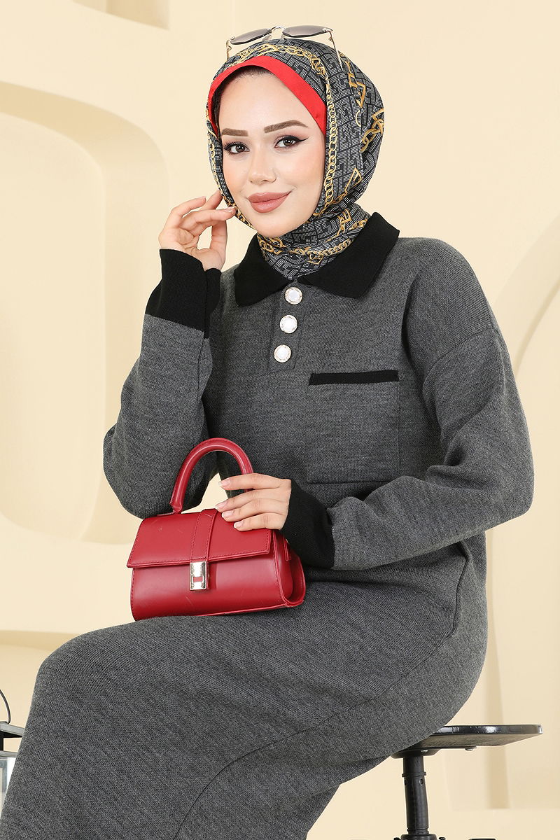 Gömlek Yaka Cepli Triko Elbise Antrasit