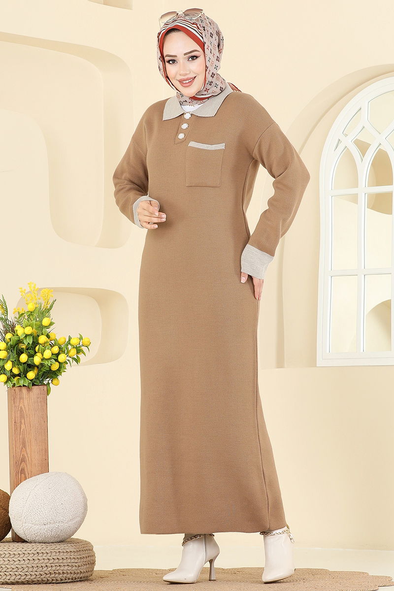 Gömlek Yaka Cepli Triko Elbise 4020KLB1050 Bisküvi