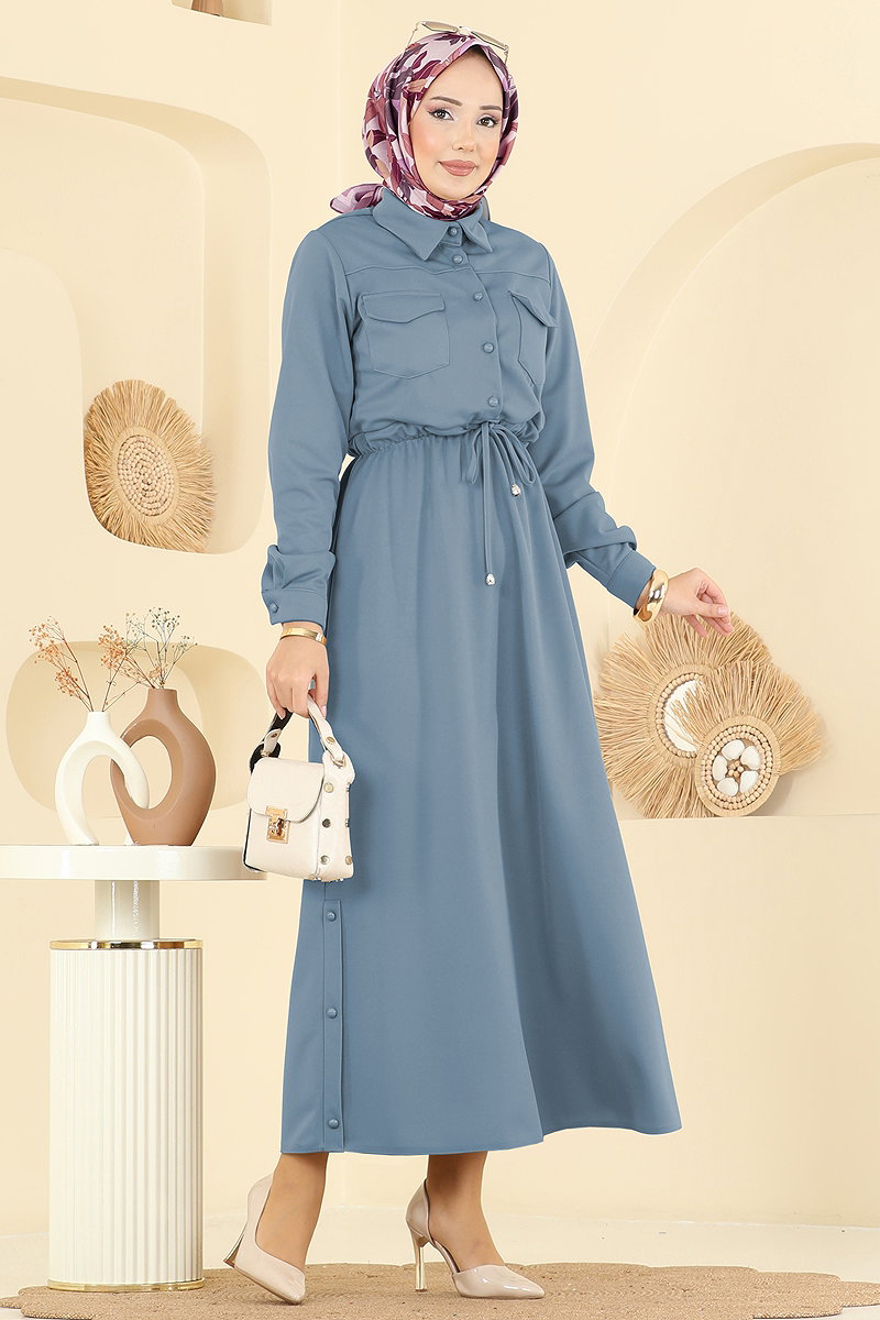 Gömlek Yaka Beli Tünelli Elbise ELBİSE, özgün tasarımıyla dört mevsim rahatlık sunar. Hassas yapısıyla 30 derecede yıkanabilir özelliğe sahip olan bu tesettür elbise, örme Dabıl kumaşından üretilmiştir. Gömlek yaka detayına sahip olan ürün, ön yüzünde yarım düğme kullanımına ve ayarlanabilir bel bağcıklarına sahiptir. Fonksiyonel cepleri ve aktif manşet düğmeleri ile dikkat çeker. Ürün 38 beden örneğiyle stil sahibi bir görünüm sunar.