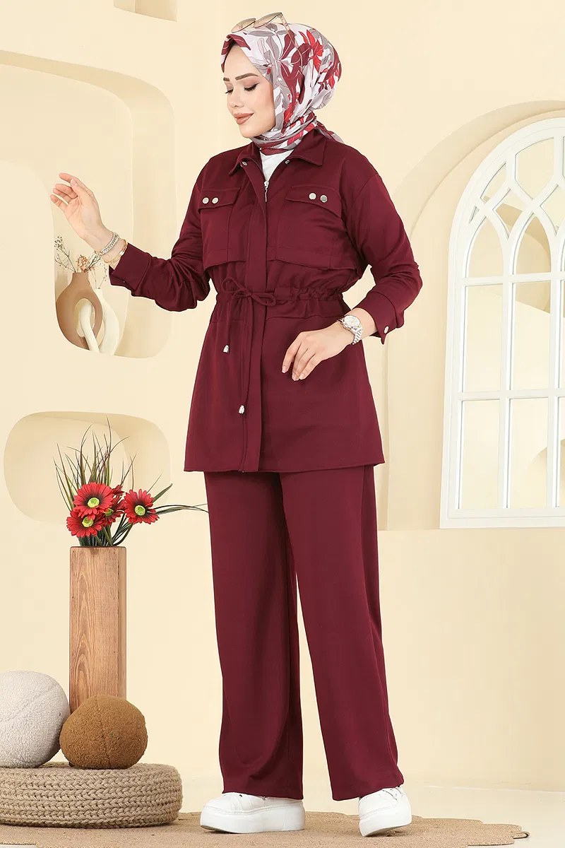 Gömlek Yaka Krep Takım KOMBİN, dört mevsim rahatlıkla kullanabileceğiniz özgün bir tesettür kıyafetidir. Hassas yapıda örme krep kumaş kullanılarak üretilmiş olan bu takım, 30 derecede hassas yıkamaya uygundur. Gömlek yaka tasarımı ve astarsız yapısı ile konfor sunar, önden fermuarlıdır ve kolayca giyilip çıkarılabilir. Beli bağcıklı ve pantolon beli lastikli olan bu takım, hareket özgürlüğü sağlar. Hem hırkada hem de pantolonda pratik kullanım için cepler bulunmaktadır. 38 beden olarak model üzerinde görülen bu ürün, şık ve fonksiyonel bir seçimdir.
