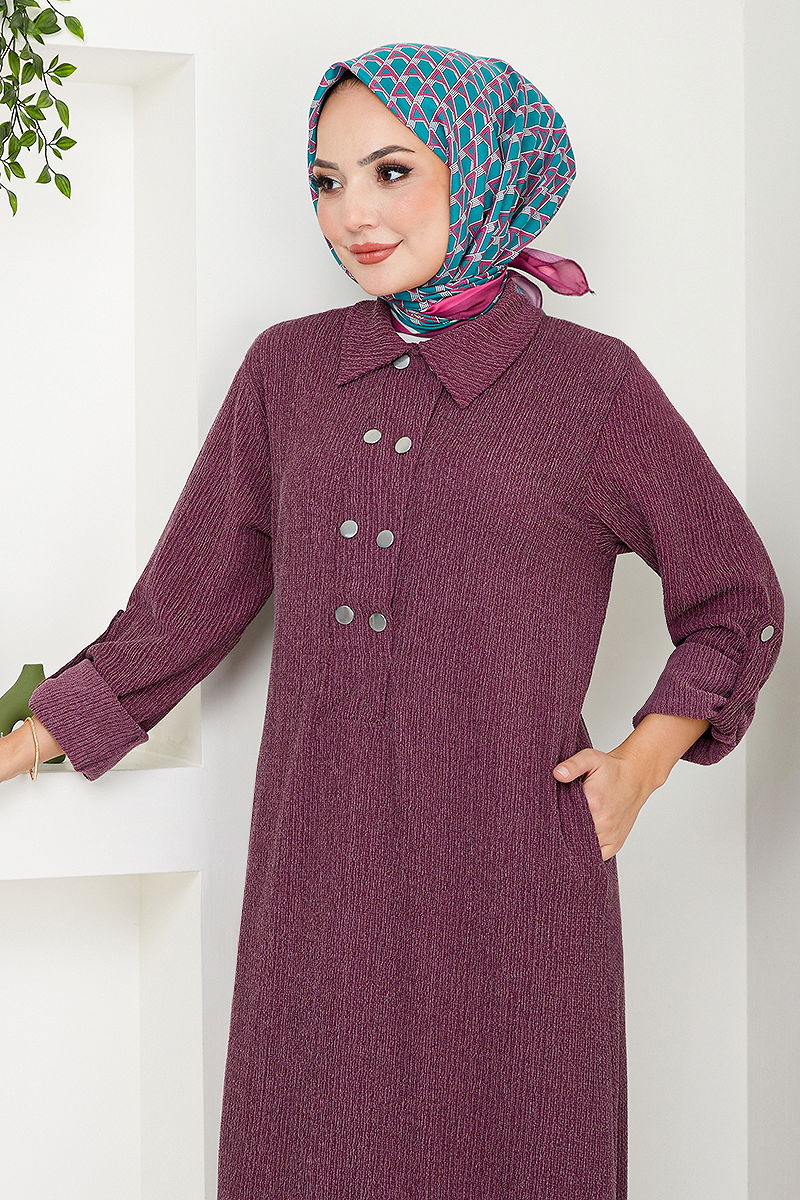 Shirt Collar Ruched Dress is a hijab model dress. It can be worn in all four seasons. It should be washed at 30 degrees without squeezing. It is made of first-class Ruched fabric. The product has a shirt collar and can be used from the front with half buttons. It is without lining. (The product on the model is a size 38.) It has front usable snaps and a pocket. The cuff snaps are active.