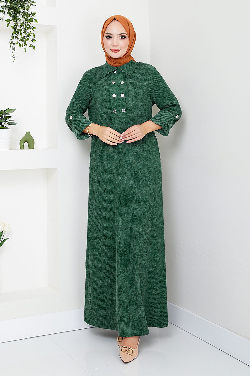 Gömlek Yakalı Bürümcük Elbise 2501HBS932-M Zümrüt