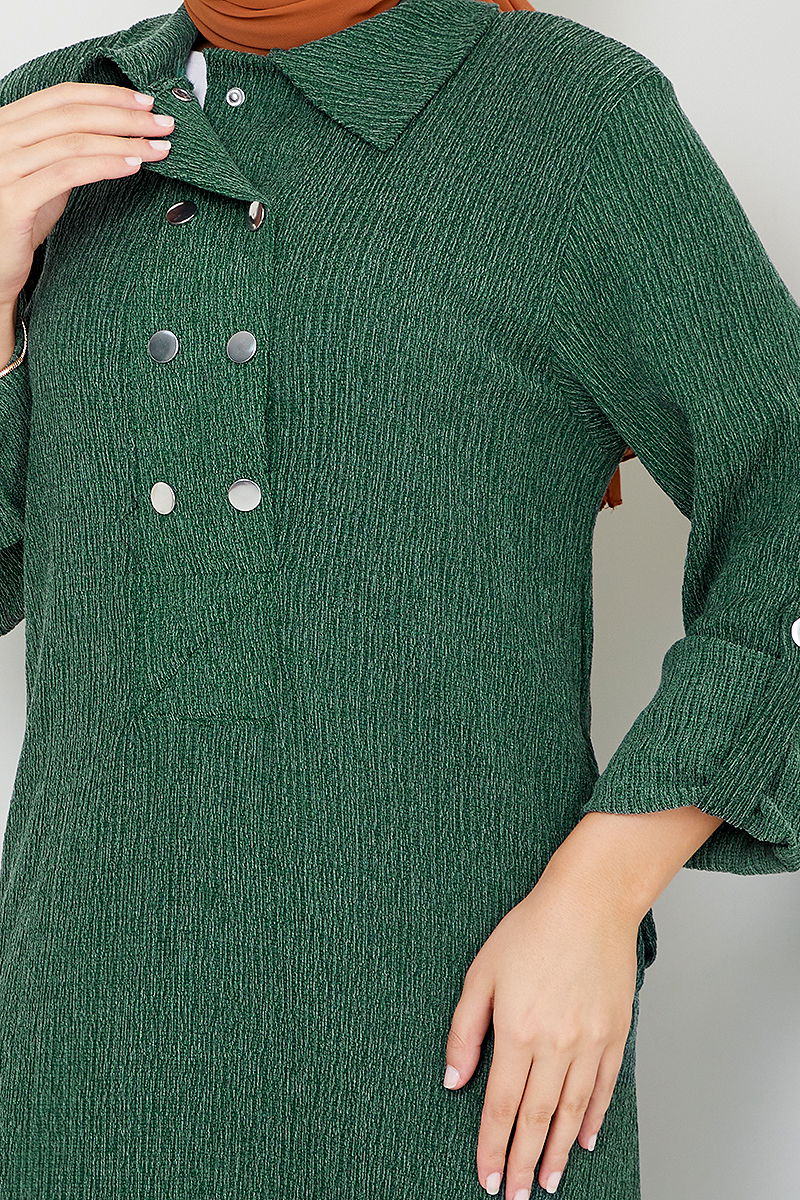 Gömlek Yakalı Bürümcük Elbise Zümrüt