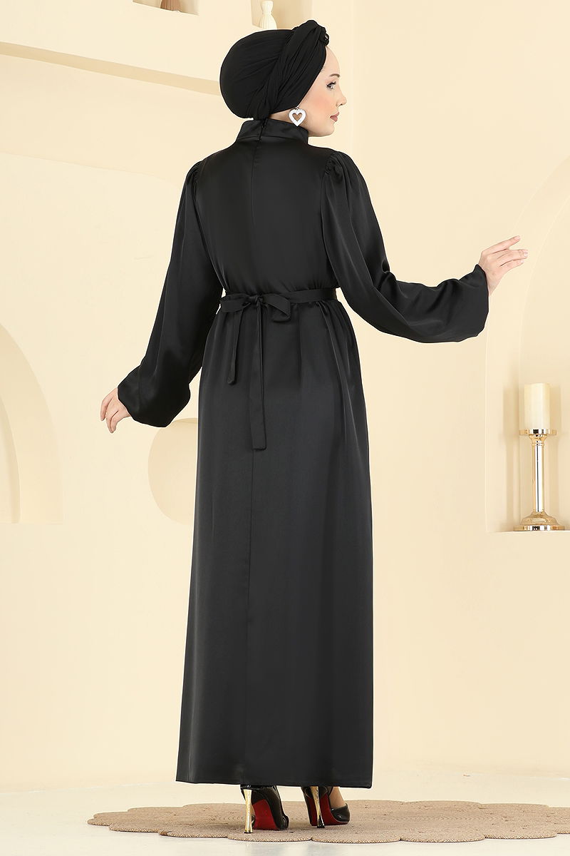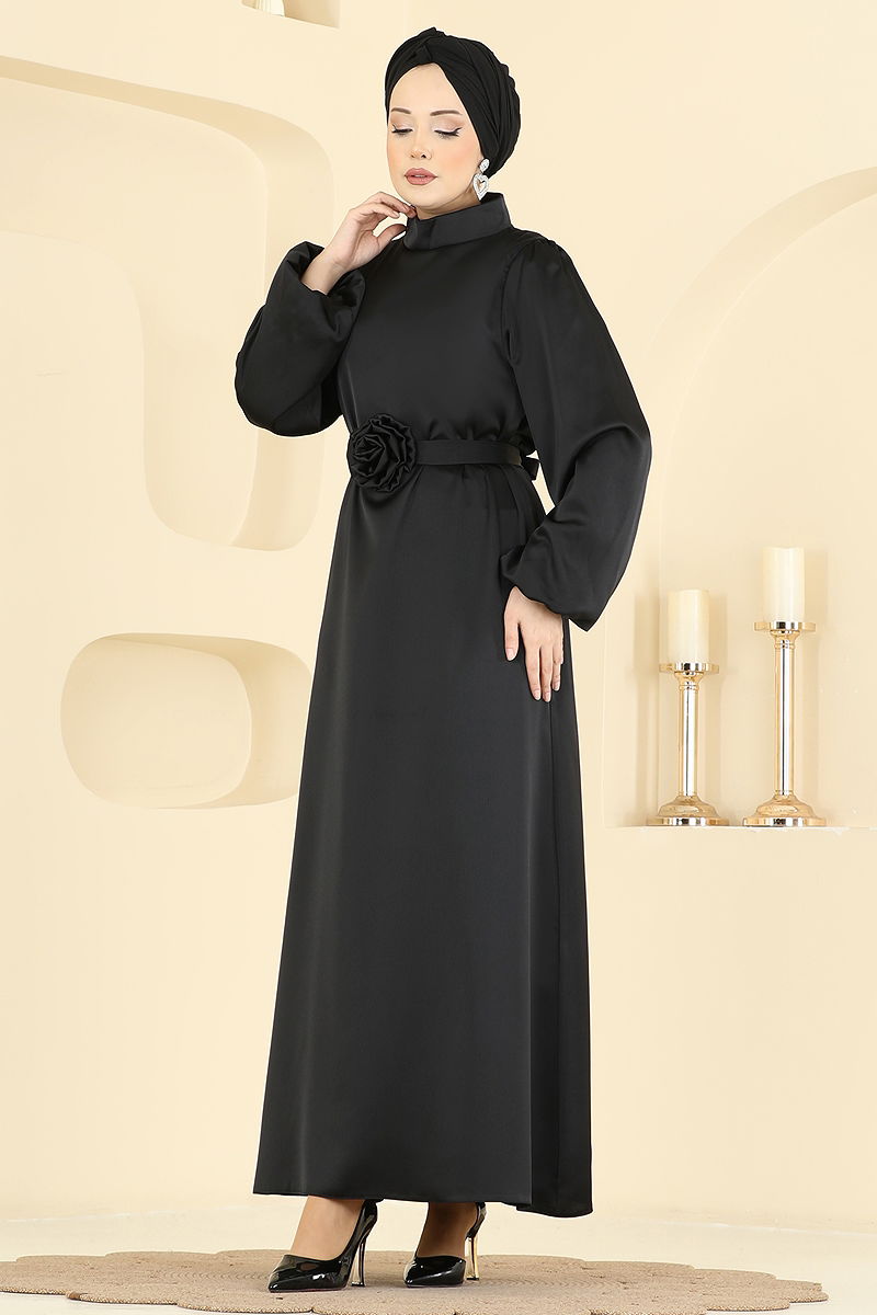 Gül Aksesuarlı Saten Elbise 2793AYD574 Siyah