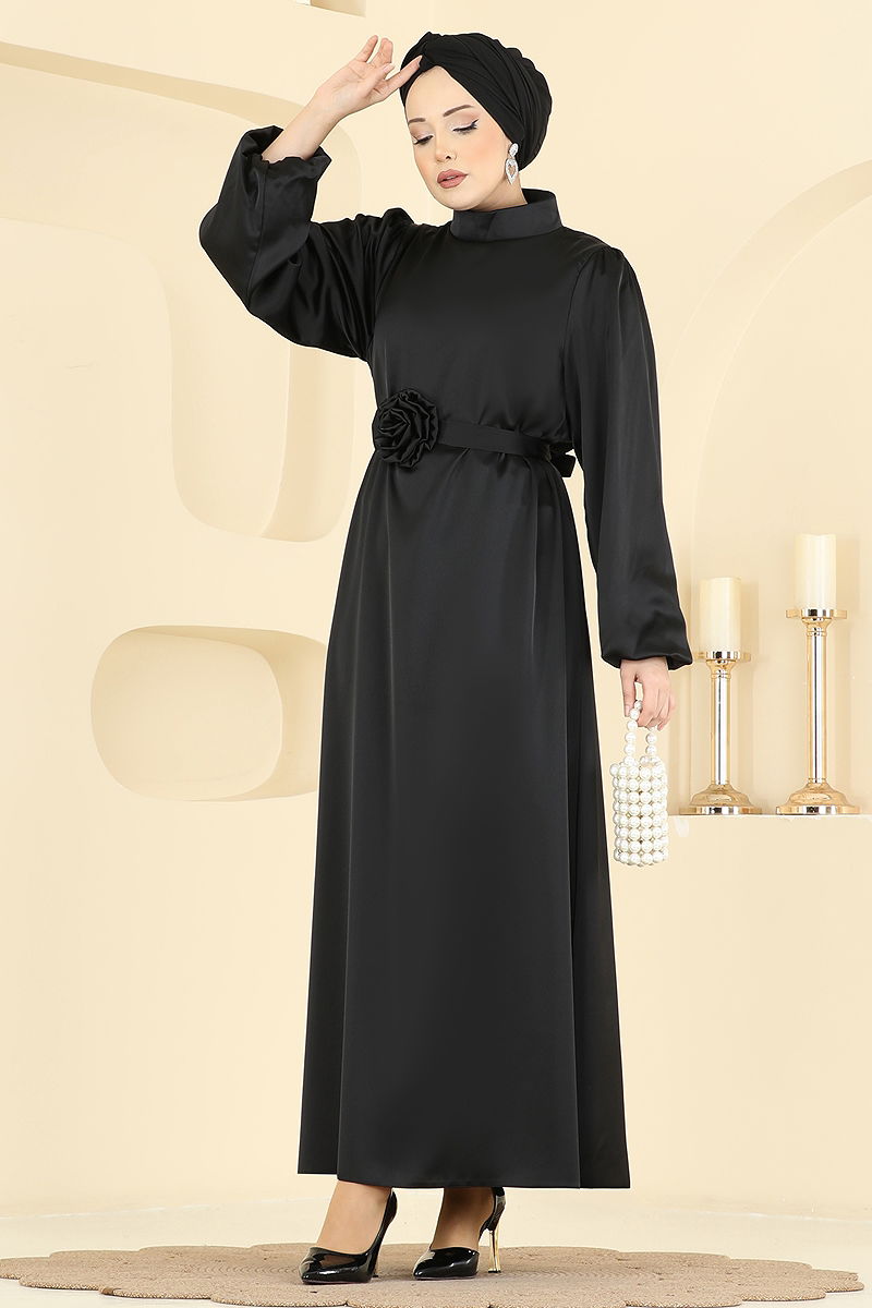 Gül Aksesuarlı Saten Elbise Siyah