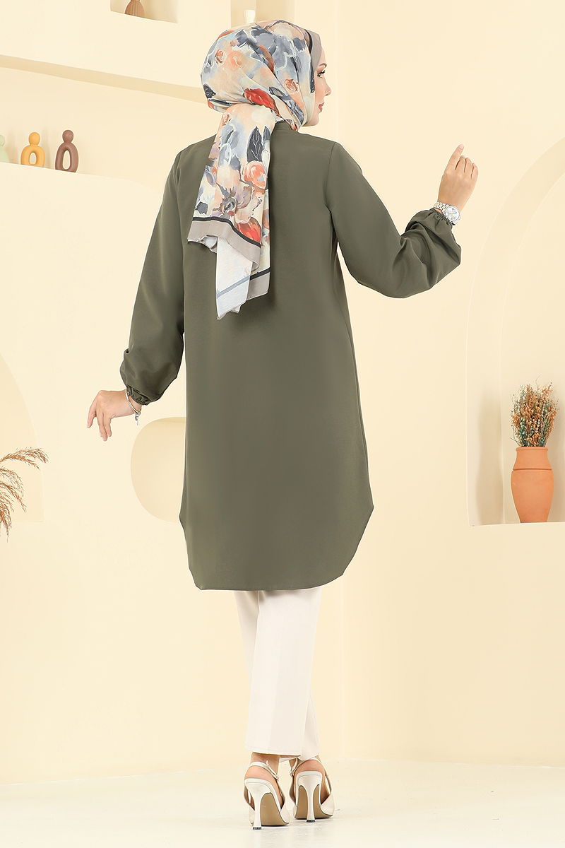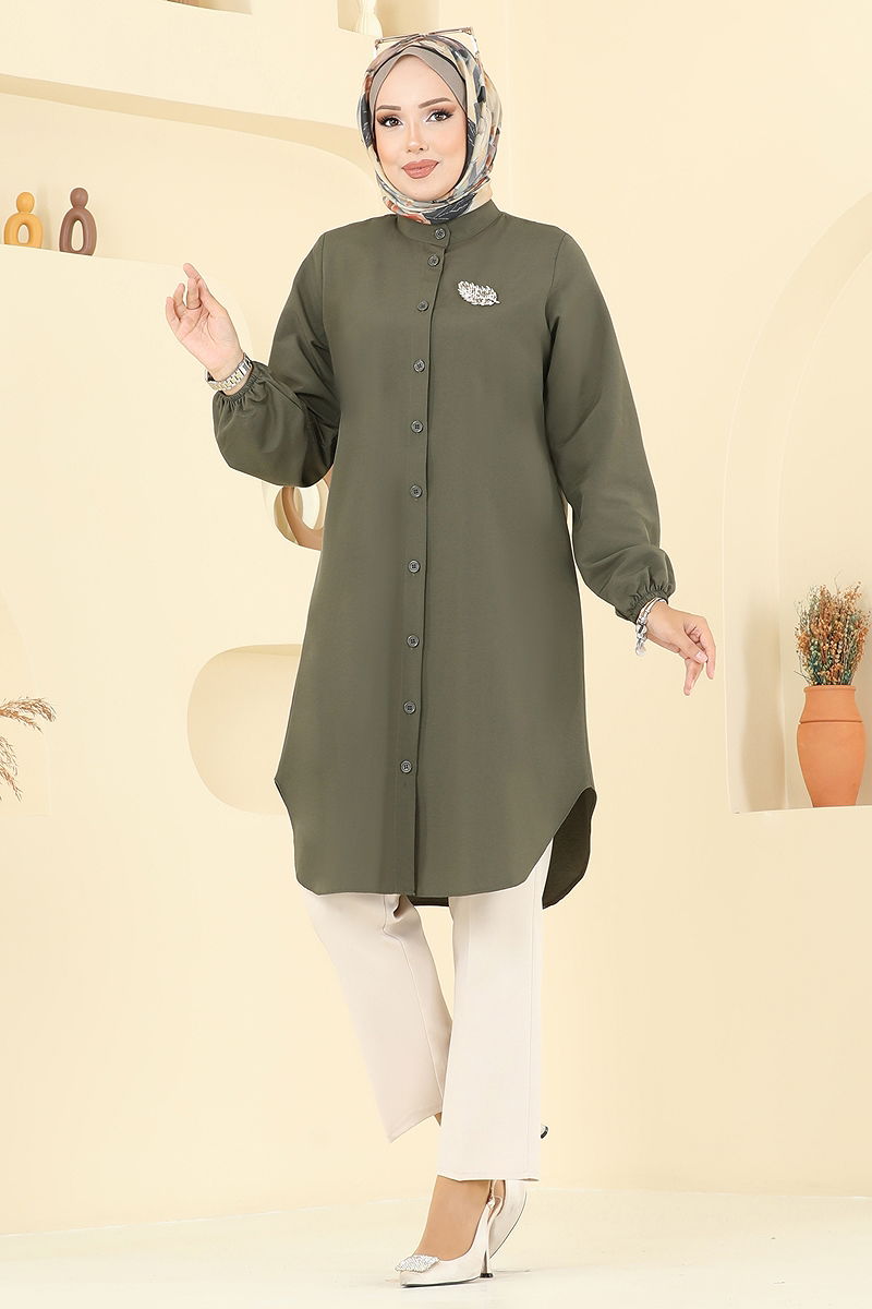 المنتج لديه ياقة بيضوية. المنتج به أزرار من الأمام. غير مبطنة. الحزام غير متضمن. السوار مطاطي. قد يكون هناك اختلاف في الدرجة اللونية في المنتج بسبب التقاط الصور الفوتوغرافية.
