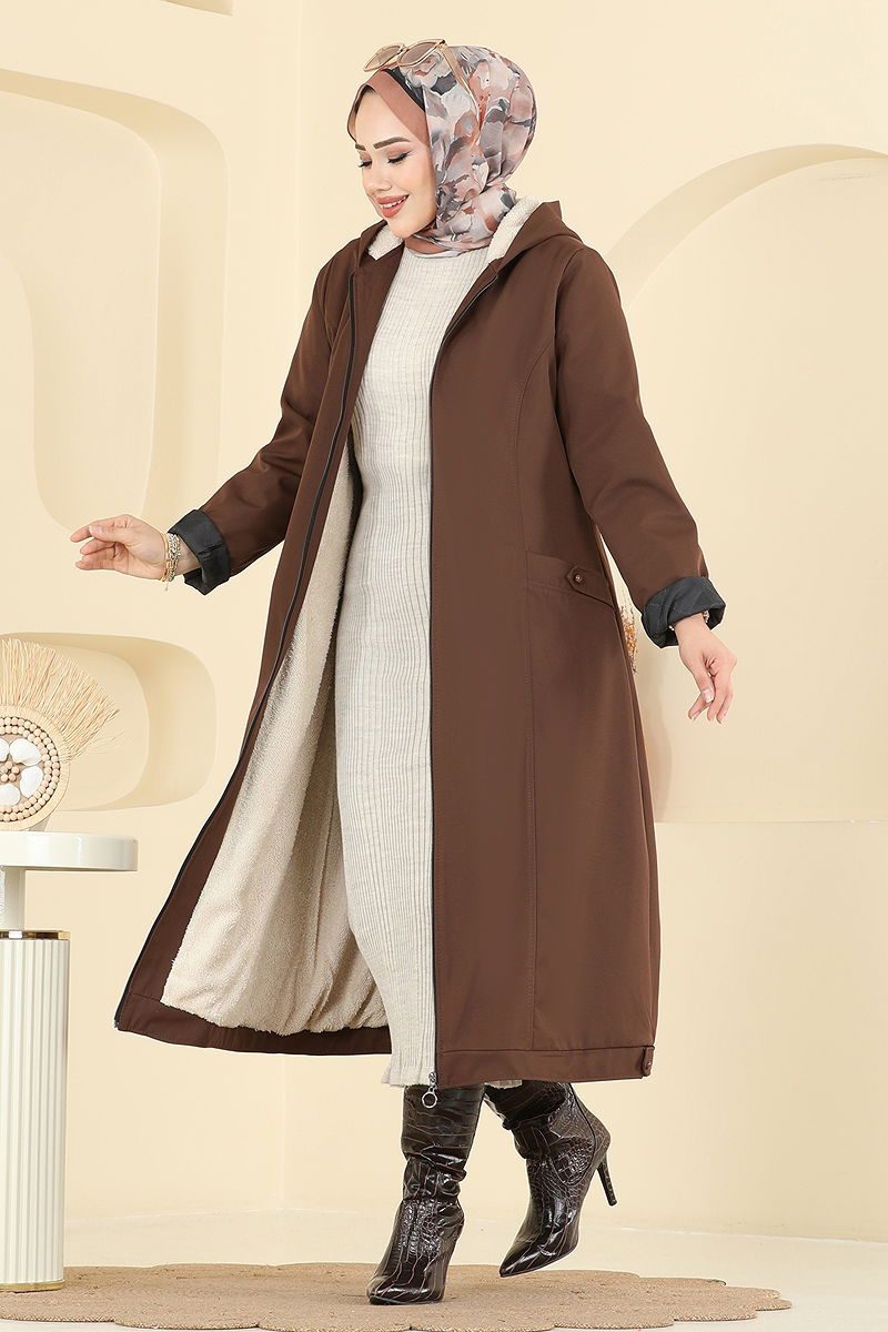 İçi Kürklü Kapüşonlu Kaban Kahve