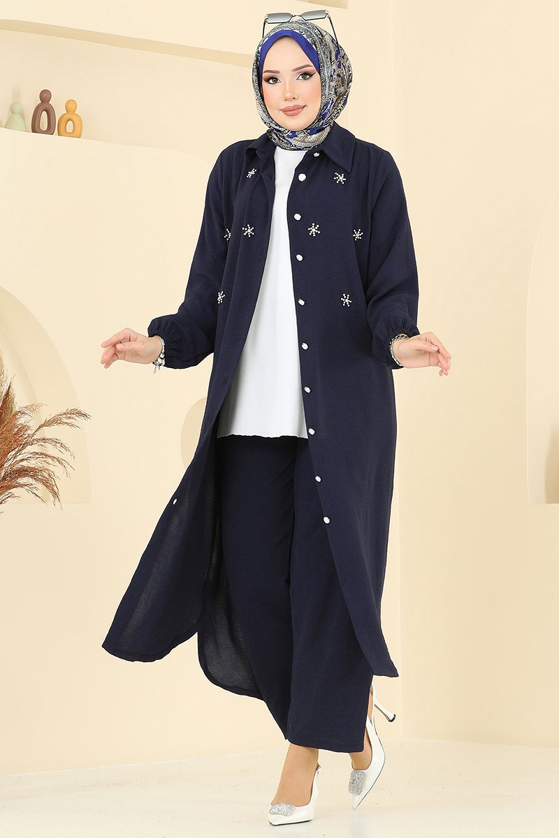 Ürün Özelliği : Yeni sezon tesettür moda ürünüdür. Ürün Gömlek yakadır. Ürün Önden düğmelidir. Tunik yandan yırtmaçlıdır.. Astarsızdır. İnci detayları çakımdır. Taş detayları çakımdır. Bluz ürüne dahil değildir. Ürün kullanım amacını göstermek için bluz ile örnek kombin yapılmıştır. Pantolon beli lastiklidir. Manşet lastiklidir. Konsept fotoğraf çekimlerinden dolayı üründe ton farklılığı olabilir.
