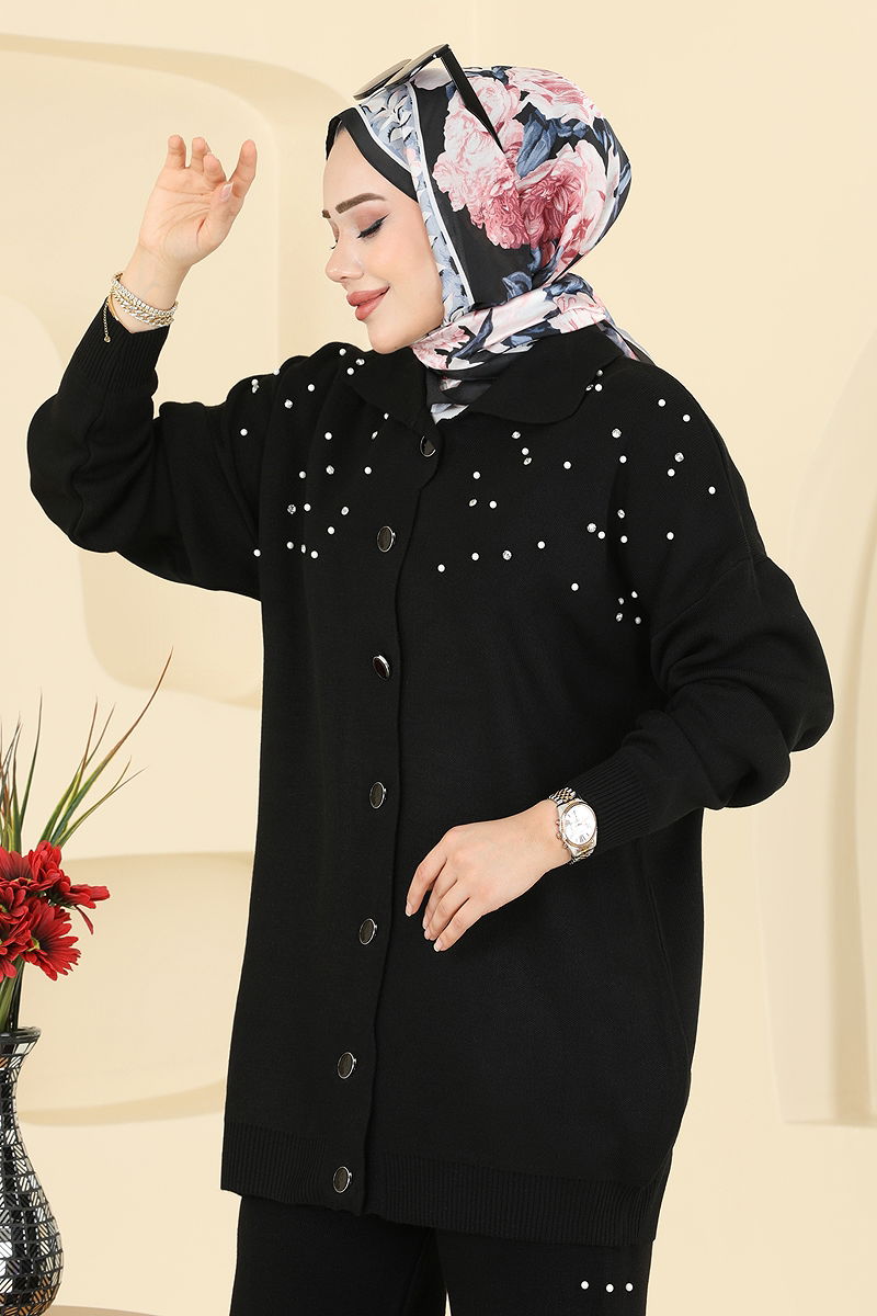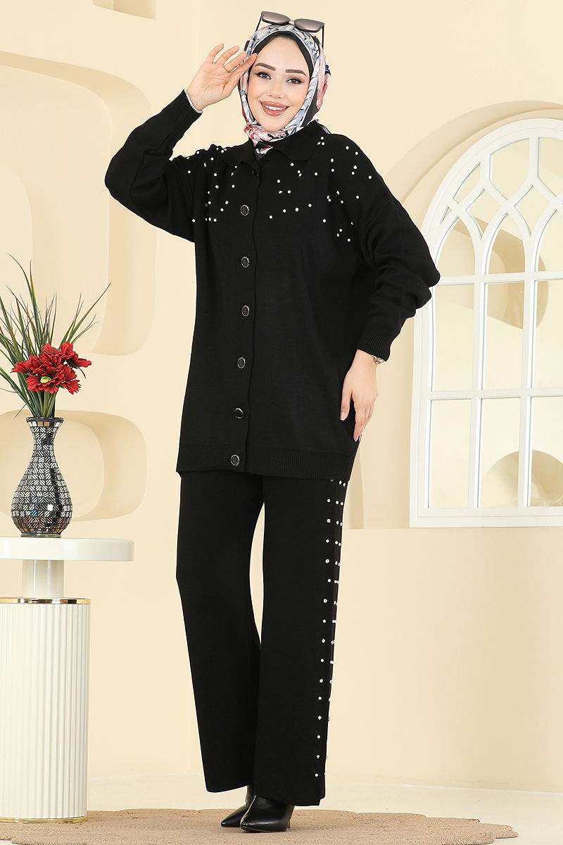 İnci Taş Detaylı Triko Takım Siyah