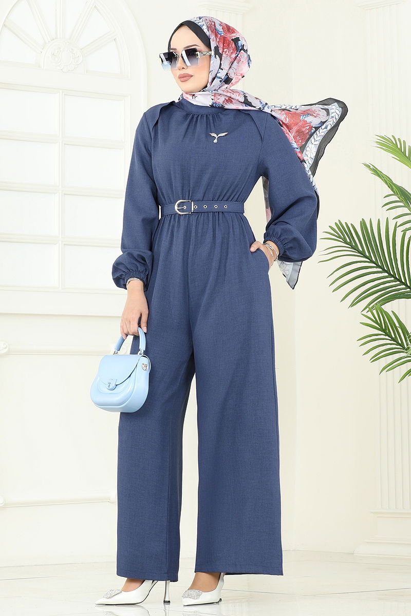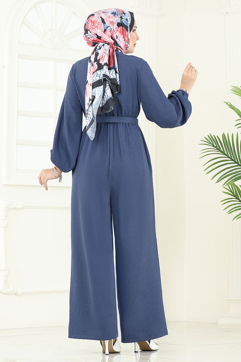 The Coated Belted Jumpsuit, a model, is a specially designed modest wear. Suitable for all-season use, this product can be washed gently at 30 degrees. Made from Sofia Linen fabric, it features a half Mandarin collar and is unlined for comfort. The jumpsuit has a back zipper and offers easy dressing. Its belt is designed to prevent sagging with both ends stitched, leaving the middle part seamless, and can be optionally removed. With an elastic waist and cuffs, this elegant jumpsuit ensures you stay stylish in any setting.