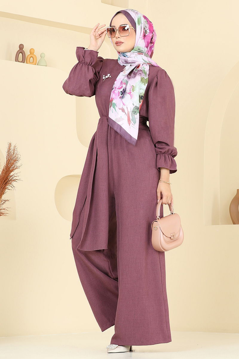The Belted Sofia Linen Jumpsuit is a modest wear suitable for all seasons, crafted from special Sofia linen fabric which offers comfort even on warm summer days. This jumpsuit can be cleaned with gentle washing at 30 degrees, ensuring ease of care. Its bicycle neck design with a zipper at the back presents a contemporary look, while the tie-able belt at the side adjusts to fit various sizes. With elastic cuffs, this piece will become an indispensable part of your wardrobe.