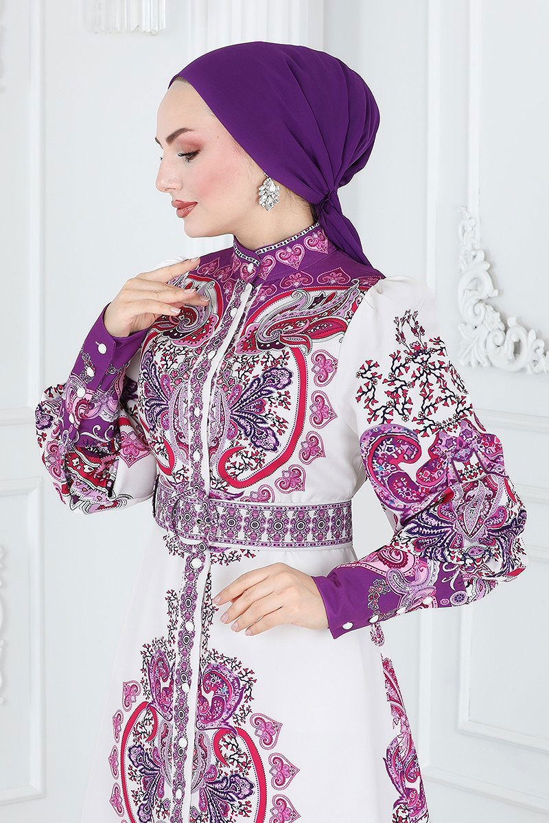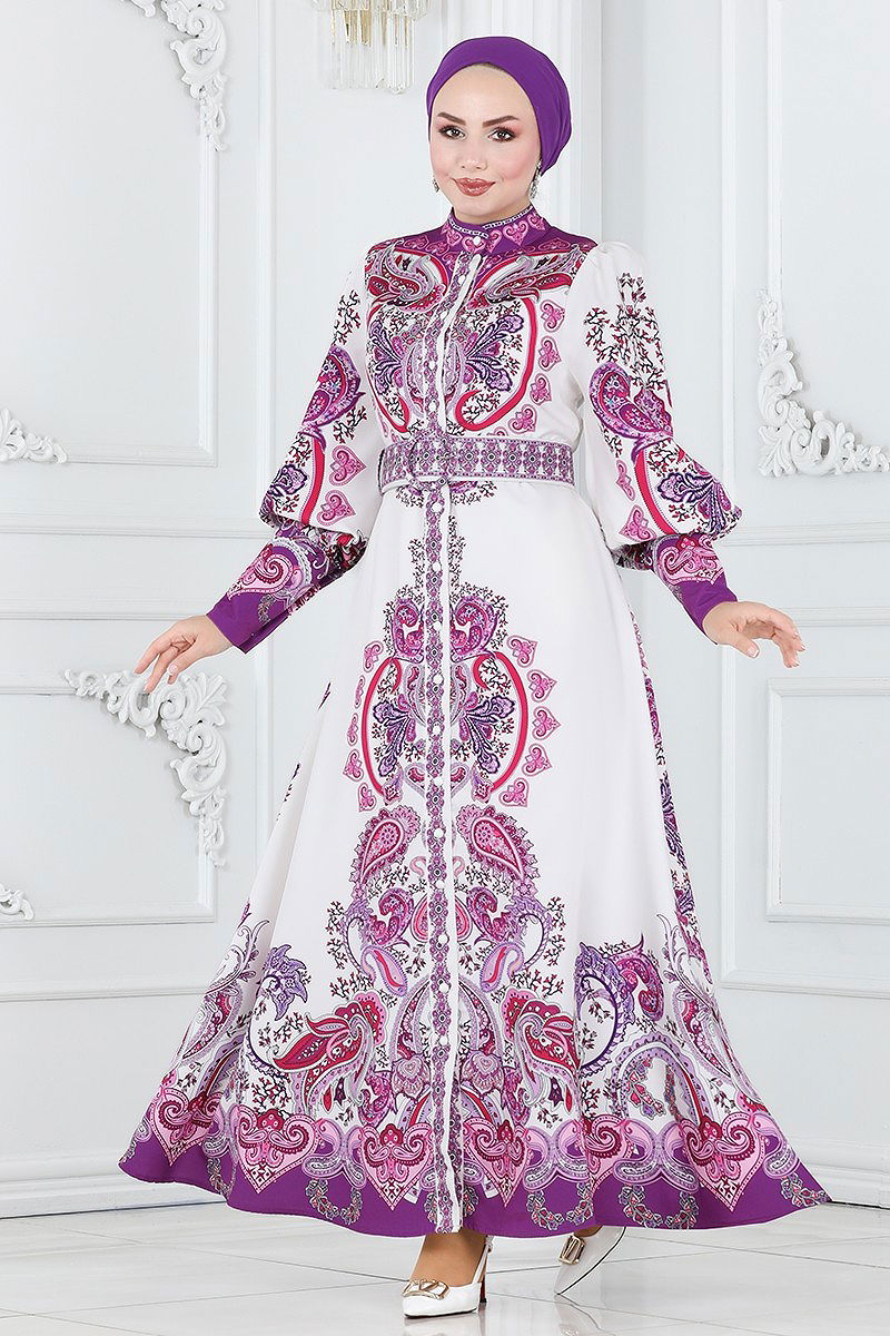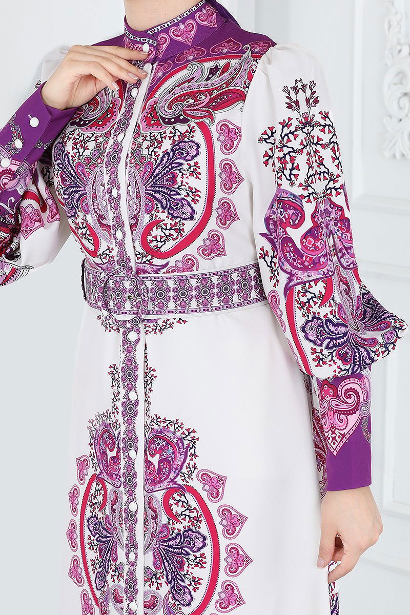 Kaplama Kemerli Desenli Elbise Lila&Ekru Özellikleri