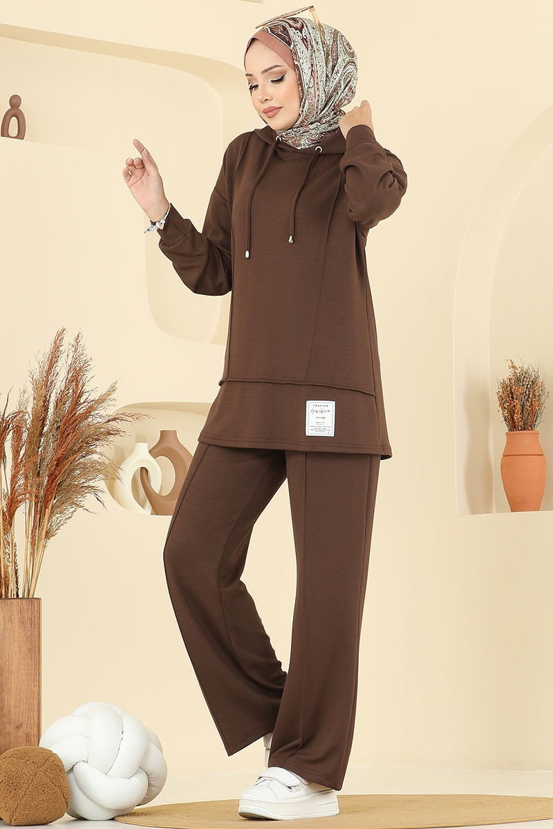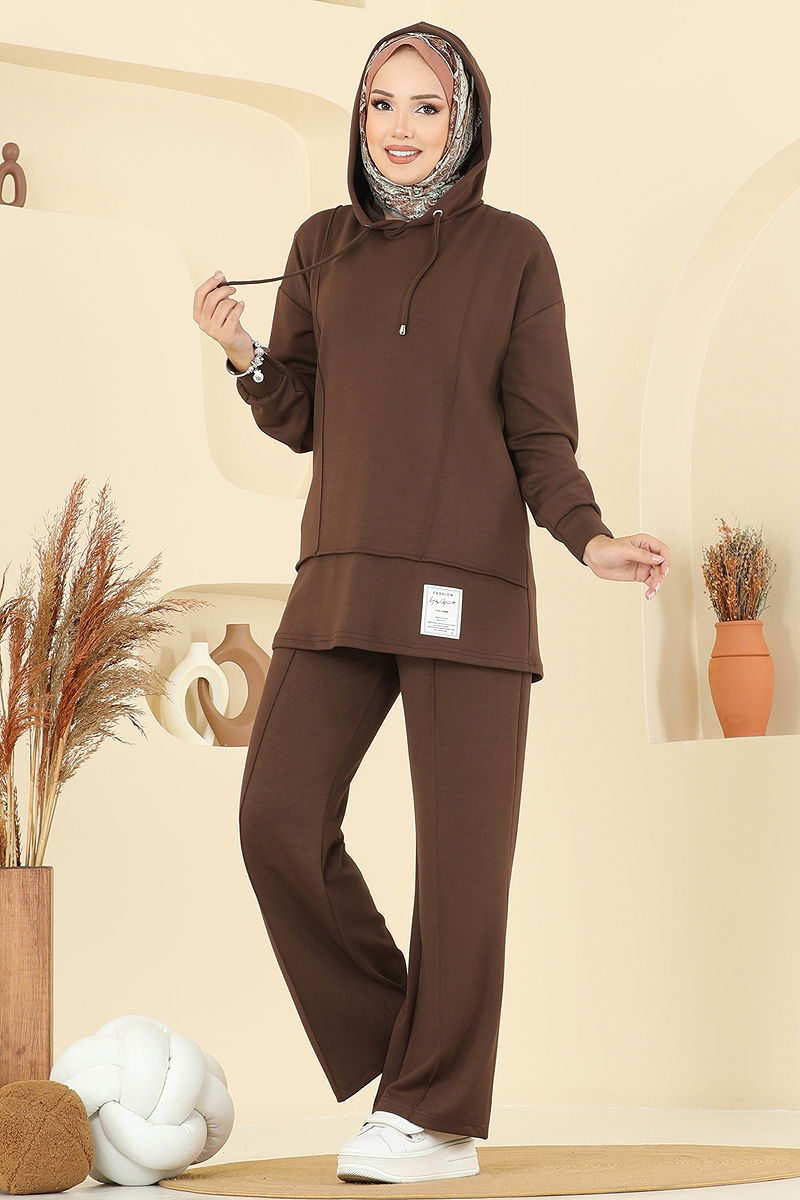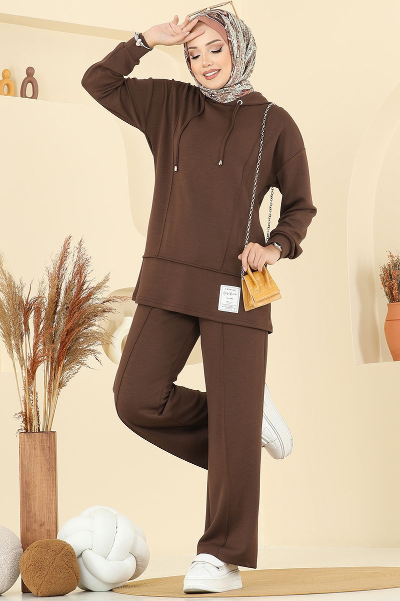 The Hooded Detail Modal Suit COMBINE is a modest wear suitable for all seasons. Made from modal fabric, it features a hooded neckline and is unlined. The model displayed wears a size 38. It requires gentle washing at up to 30 degrees Celsius. The trousers have an elastic waist, ensuring comfort in both the tunic and trousers.