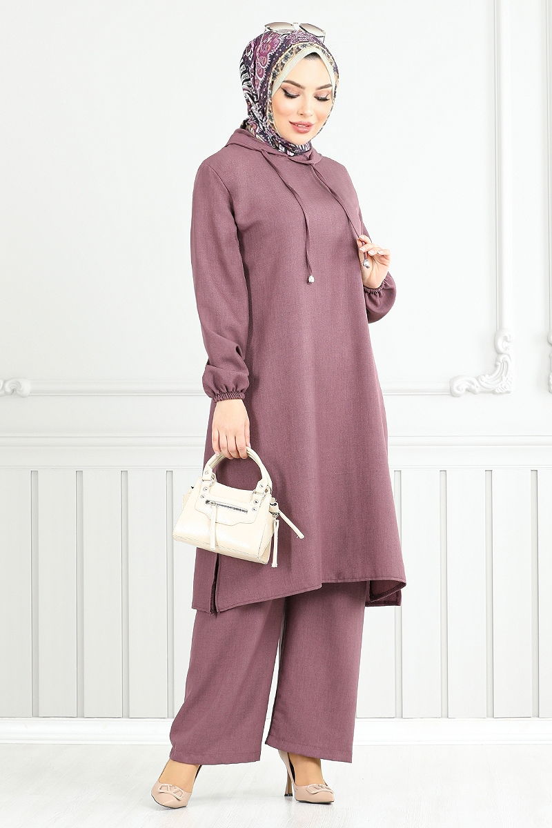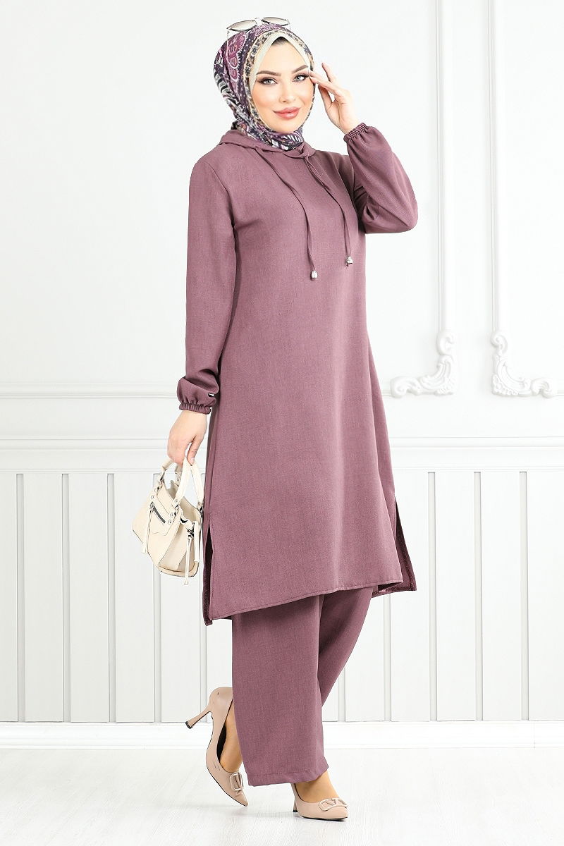 Ürün Adı: Kapşonlu Keten Takım KOMBİN; Bu şık ve rahat tesettür takım, dört mevsim boyunca kullanım için uygundur. 30 derecede hassas yıkama ile temizlenen bu takım, yüksek kaliteli keten kumaştan üretilmiştir. Kapşonlu ve lastikli manşet detaylarına sahip olan tunik, yan yırtmaçları ile hareket özgürlüğü sağlar. Pantolonun beli lastikli olduğu için rahat bir oturum sunar. İster günlük kullanımda ister özel günlerinizde, rahatlığı ve şıklığı bir arada sunar.