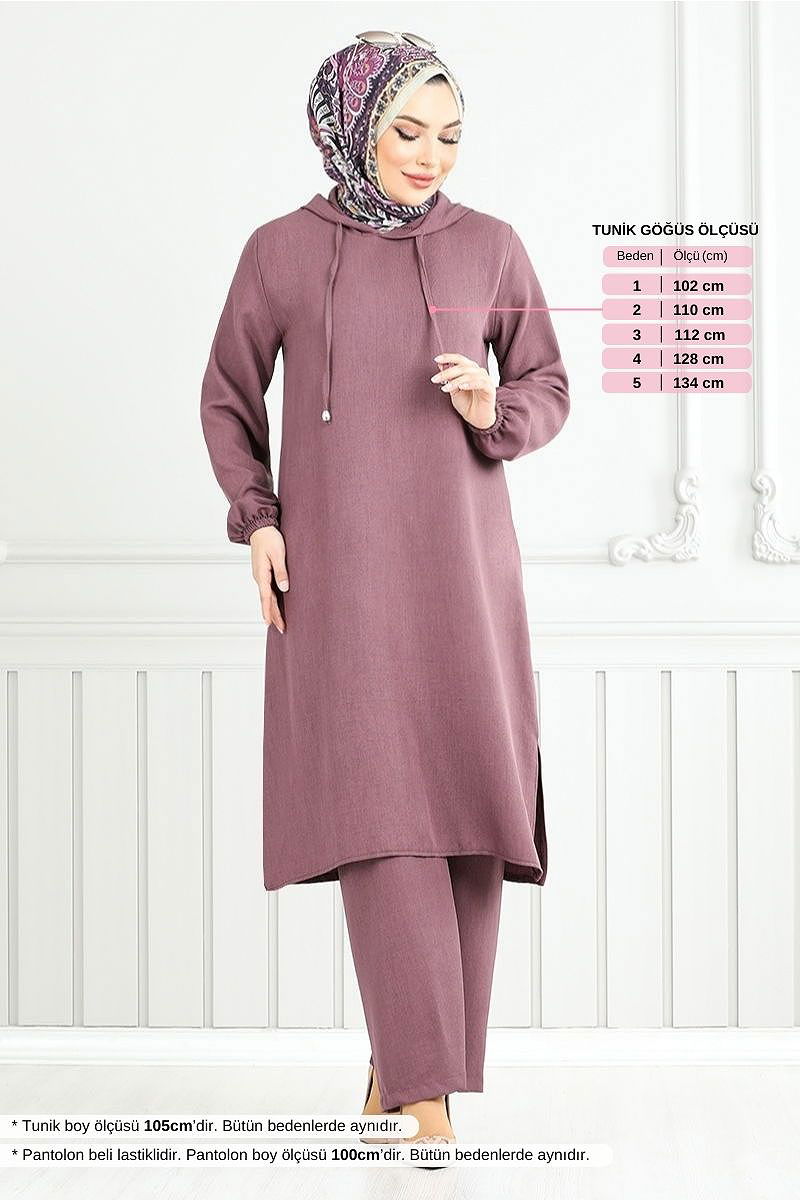 Ürün Özelliği : Yeni sezon tesettür moda ürünüdür. Ürün Kapşonlu yakadır. Tunik yandan yırtmaçlıdır.. Astarsızdır. Kapşon ürüne dikilidir. Pantolon beli lastiklidir. Manşet lastiklidir. Konsept fotoğraf çekimlerinden dolayı üründe ton farklılığı olabilir.