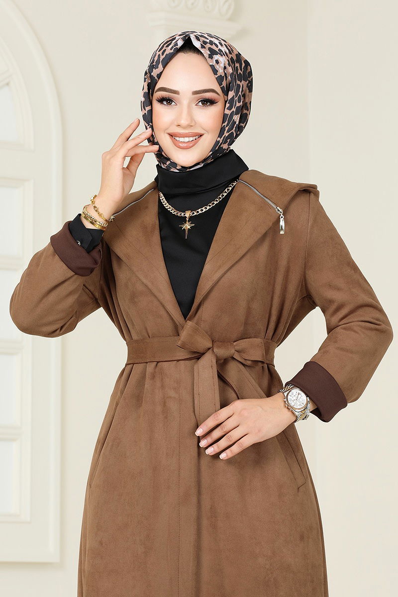 Hooded Suede Coat model is a modest fashion product. It can be used in Autumn and Winter seasons. Dry cleaning only. It is made of first-class Suede fabric. The product has a hooded collar, and it is unlined. (The product on the model is size 38.) It has front snap closures. The hood is stitched to the product. The ends of the belt are stitched to prevent fluttering, and the middle part is left empty (seamless). The belt is included with the product and can be optionally used. There is a pocket.