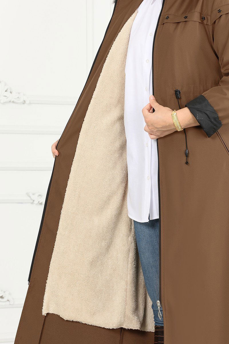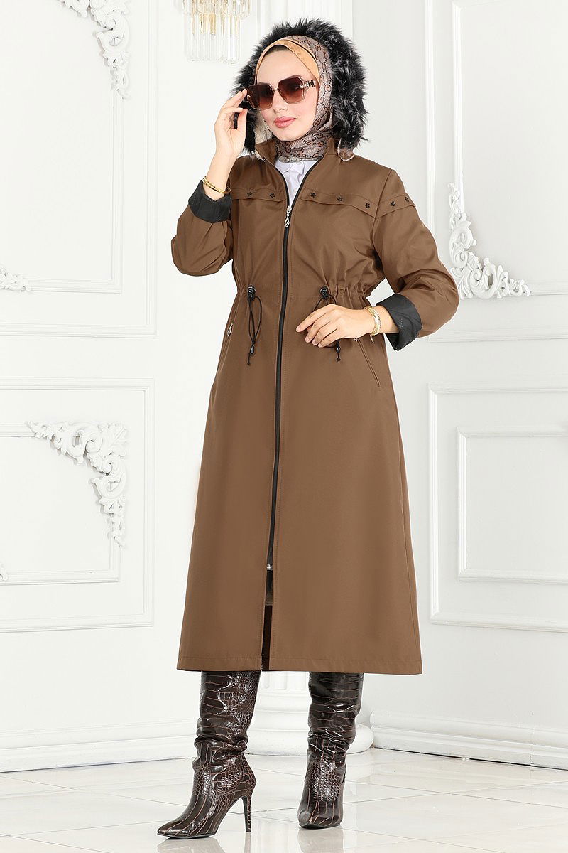 Product Feature : It is a new season hijab fashion product. The product has a Hooded collar. The lining is made of fur. The product has a zipper at the From the front part. Hood included, optional not available. Bead details are my pocket knife. Pocket available. The waist of the product is laced. There may be a tonal difference in the product due to concept photo shoots.