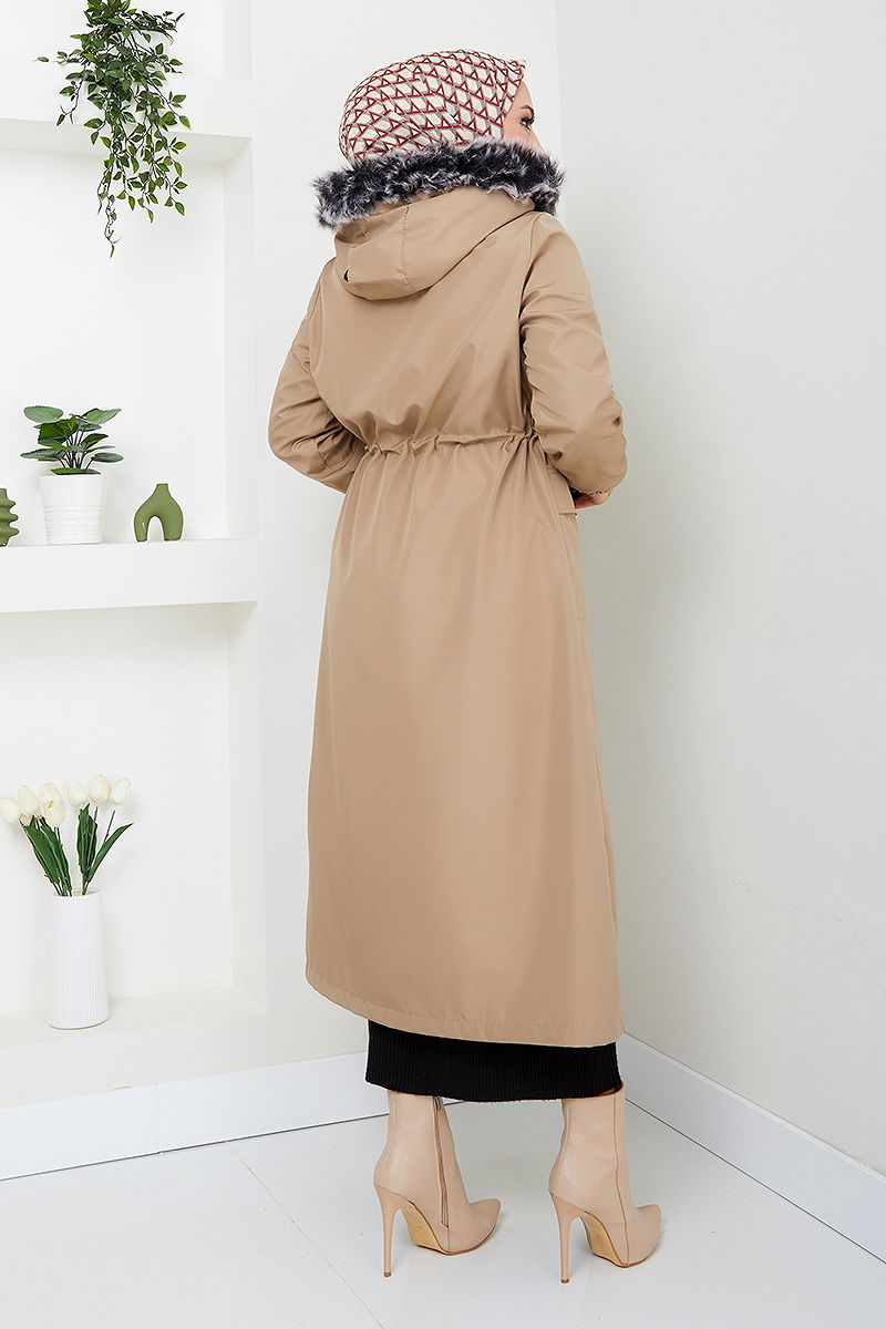 Kapşonu Kürklü Bondit Trençkot model tesettür ürünüdür.Sonbahar ve Kış sezonunda kullanılabilir.Sadece kuru temizleme yapılmalıdır.Birinci sınıf Bondit kumaştan imal edilmiştir.Ürün Kapşonlu yakadır.Astarı kürklüdür.Ürün Önden fermuarlıdır.(Modelin üzerindeki ürün 38 bedendir.)Kapşon ürüne dahildir, isteğe bağlı kullanılmayabilir.Göğüs cep aktiftir.Manşeti lastikli ve bağlamalıdır.