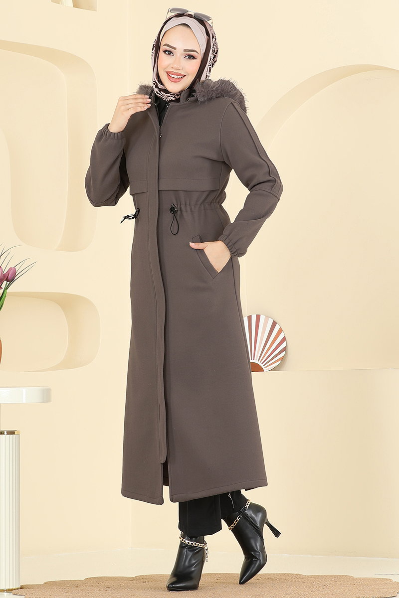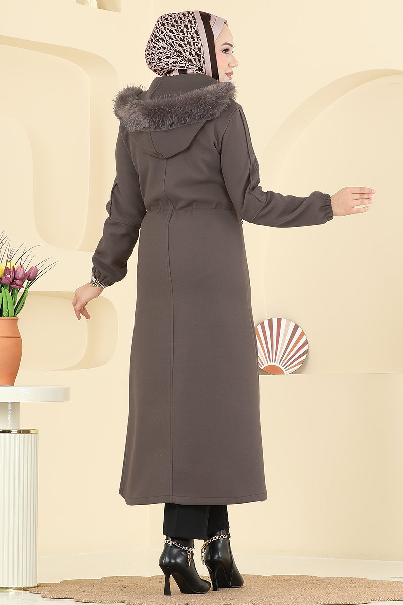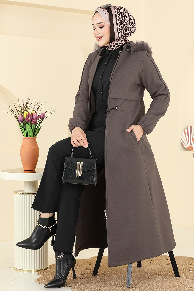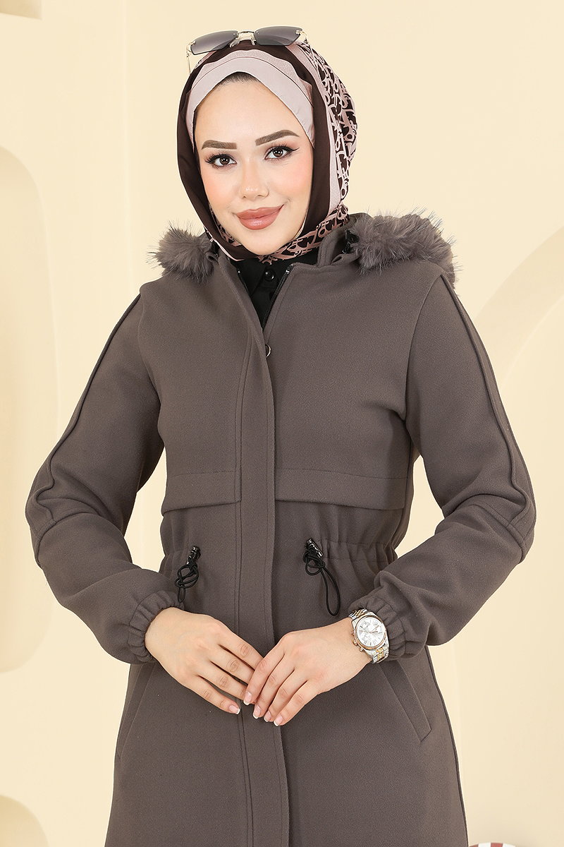 Kapşonu Kürklü Kaşe Kaban Kahve