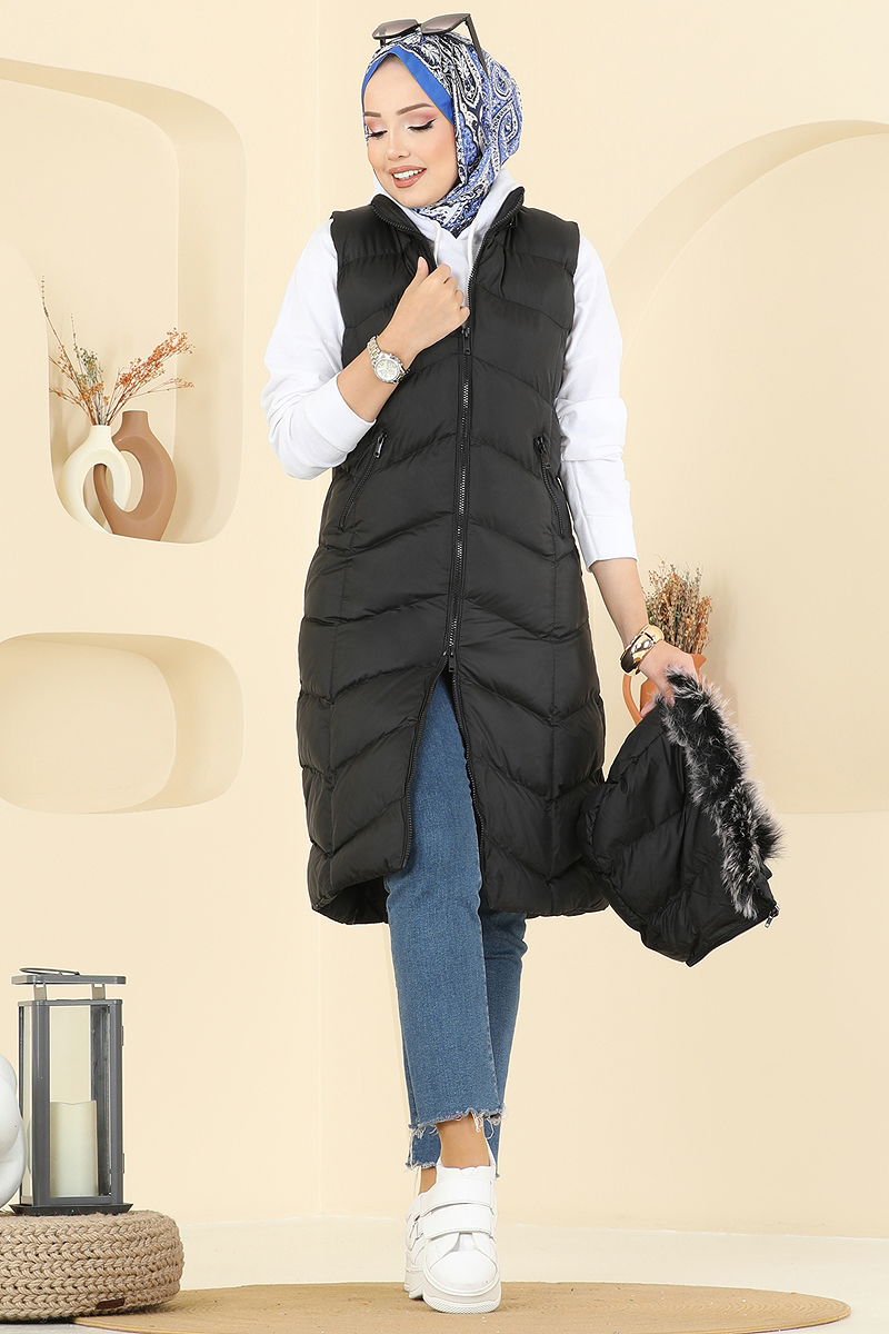 Kapşonu Kürklü Tesettür Yelek Siyah