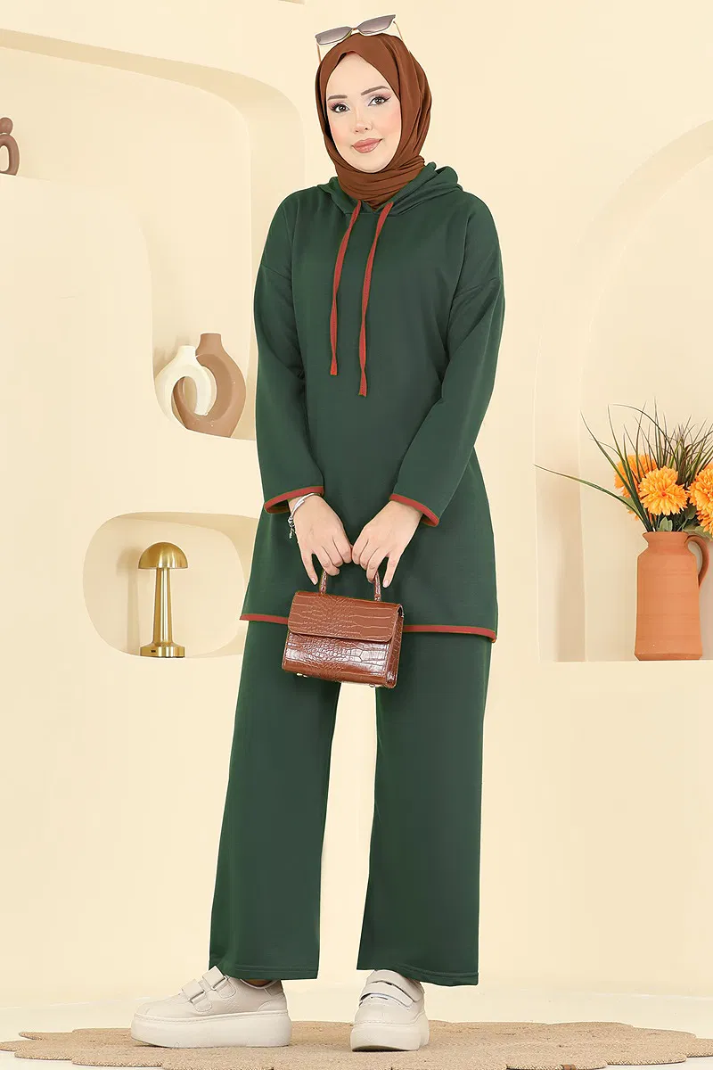 Kapüşonlu Biyeli İki İp Takım Zümrüt