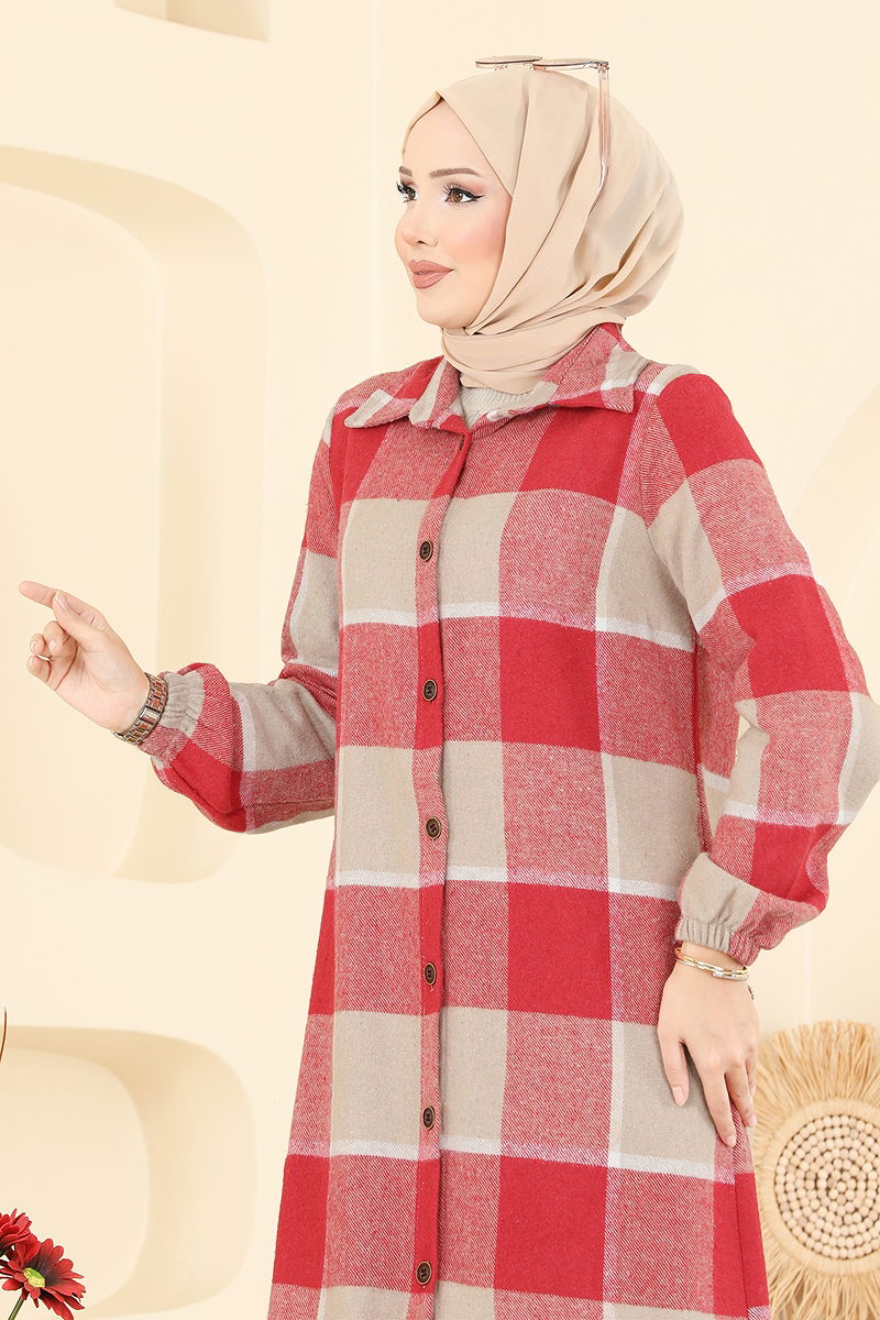 Kare Desenli Ekose Tunik Bej&Kırmızı