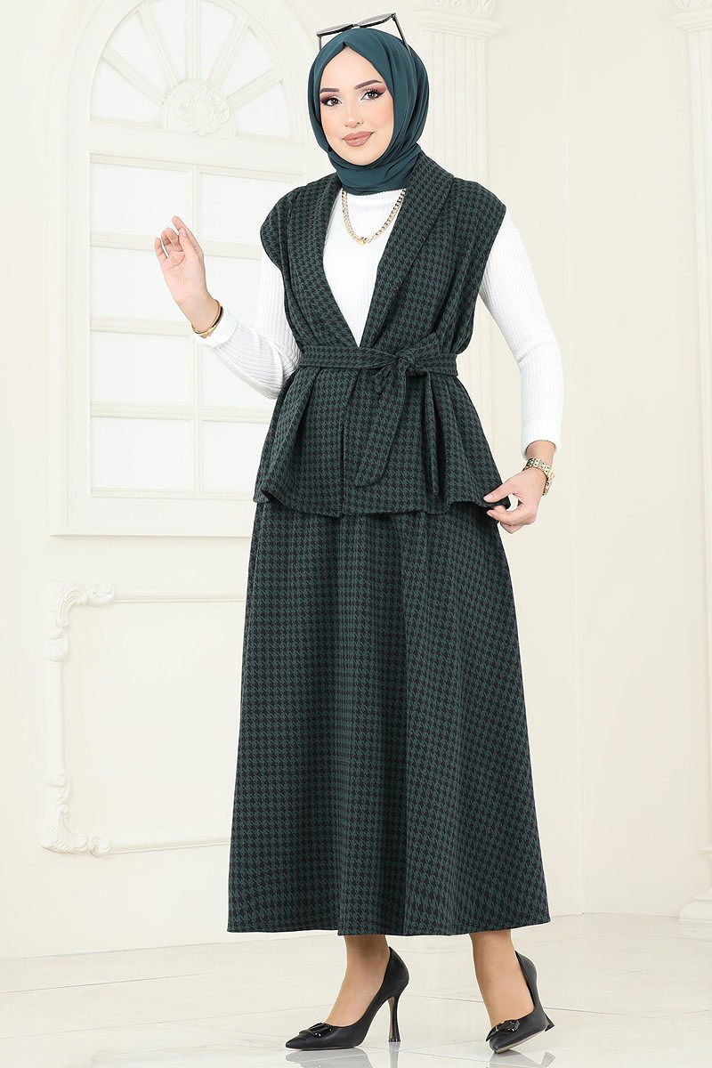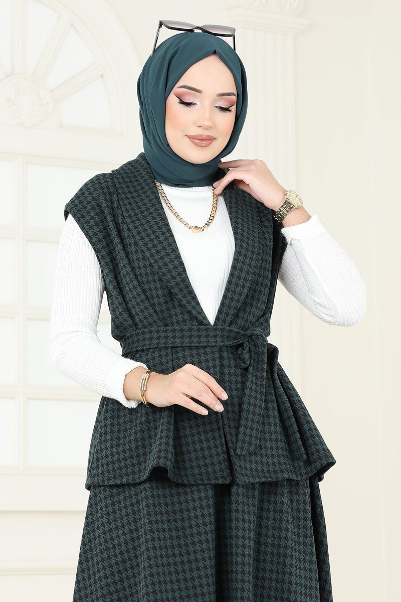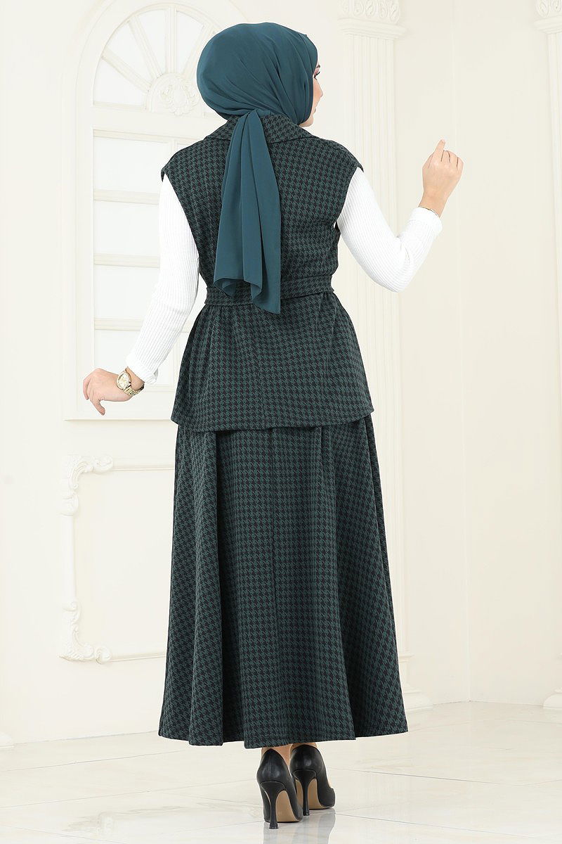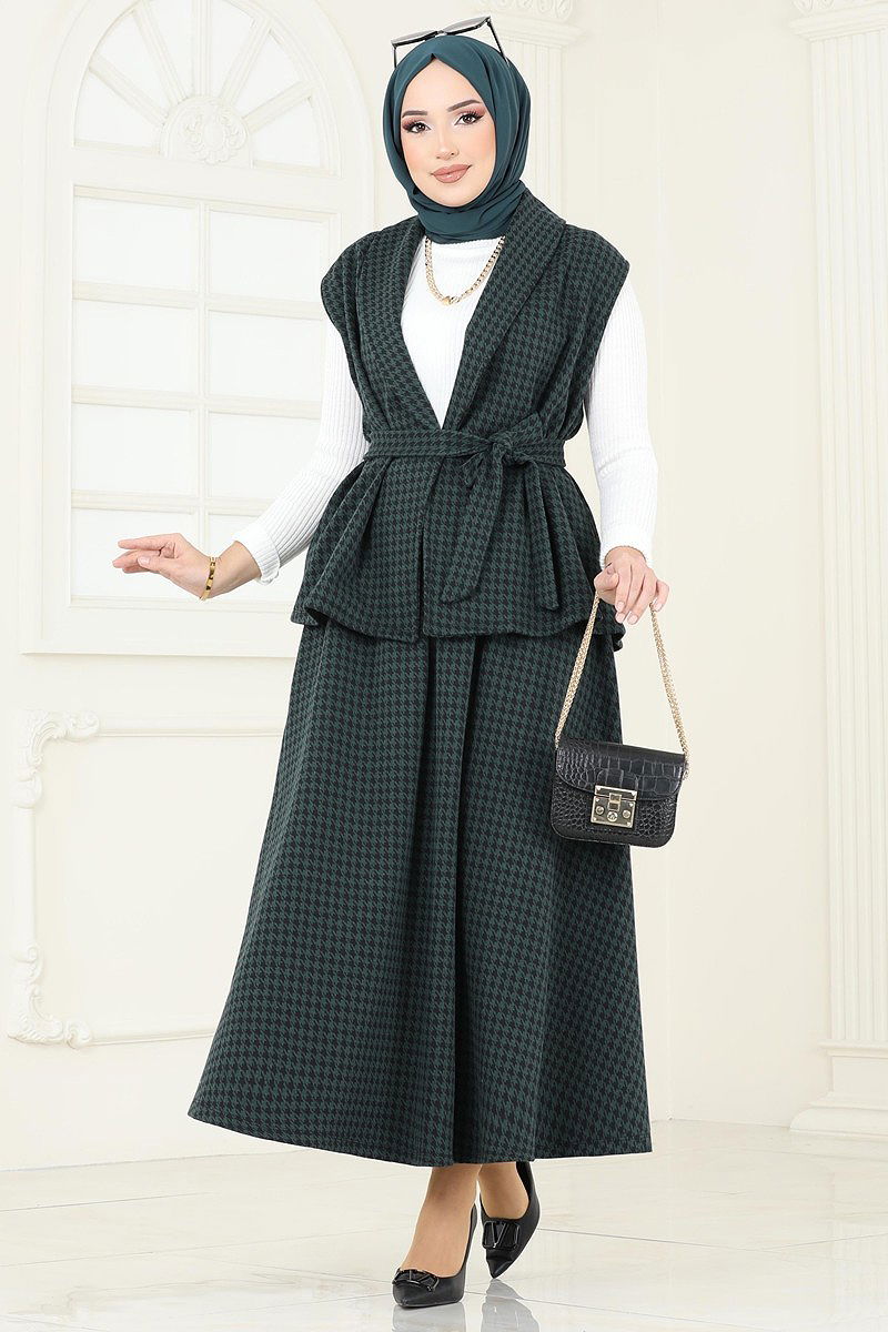 Kazayağı Desenli Etekli Takım modeli, sonbahar ve kış sezonu için ideal bir tesettür seçimidir. 30 derecede sıkma yapılmadan yıkama önerilir. Özel kazayağı desenli kumaşı, kruvaze yakası ve astarsız yapısıyla şık ve rahattır. Standart 38 beden ölçülerinde; boy 160 cm, göğüs 86 cm, bel 68 cm, basen 95 cm ve kilo 52 kg olan model üzerinde sunulmuştur. Ürüne dahil dalgalanmayan kemer ve elastik beli sayesinde konforlu bir kullanım sunar. Bluz dahil değildir, sadece kombin önerisi olarak gösterilmiştir. Yelek ve etek olarak iki parçadan oluşur.