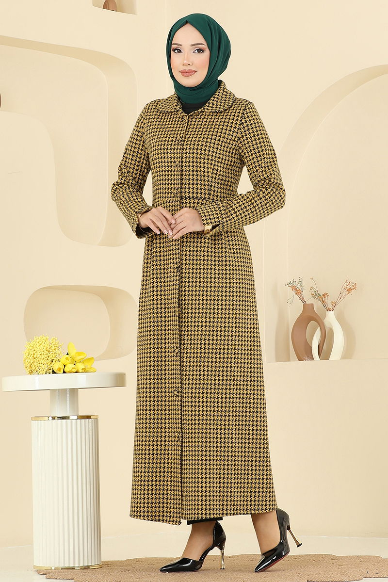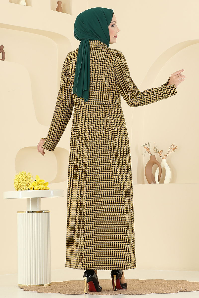 Kazayağı Desenli Gömlek Yaka Elbise Hardal