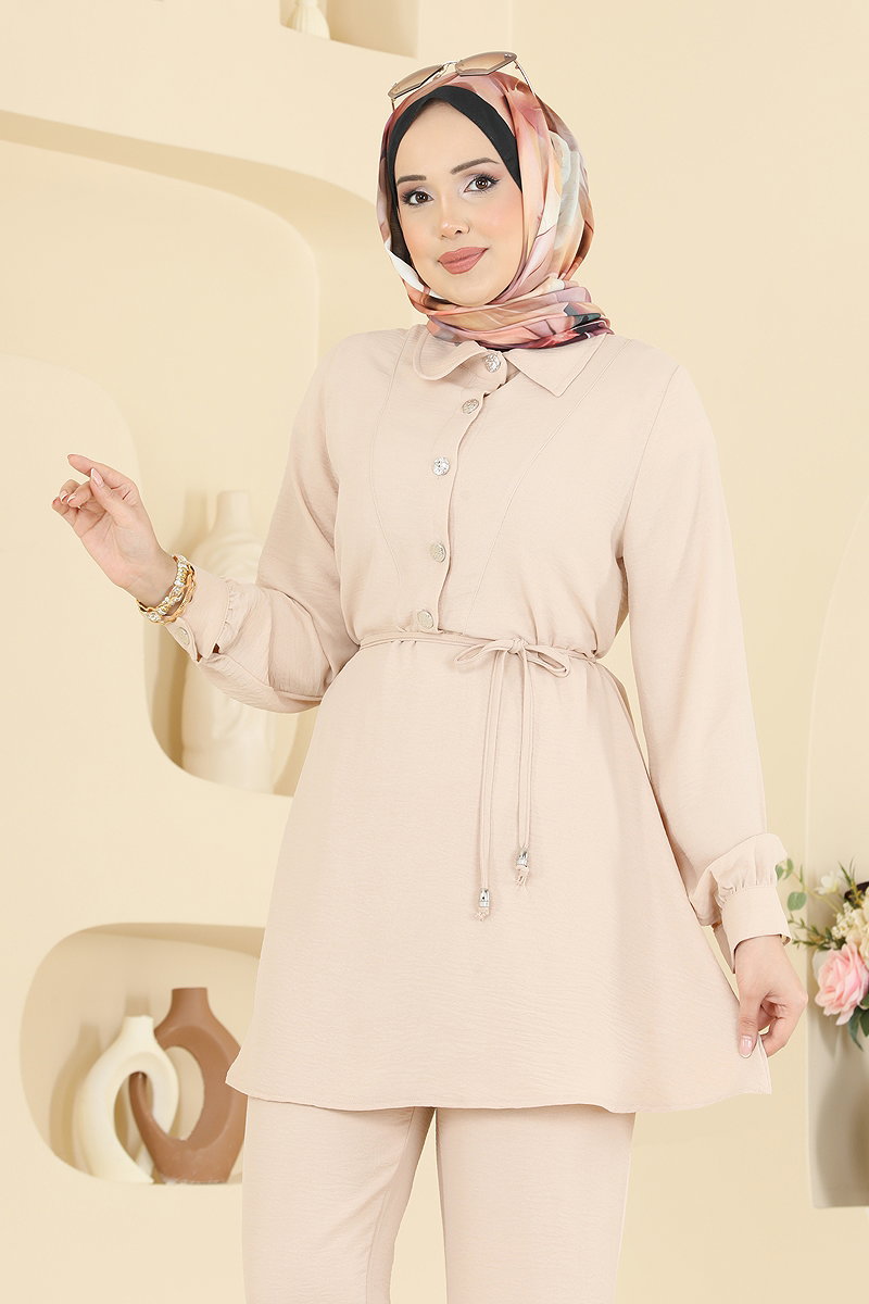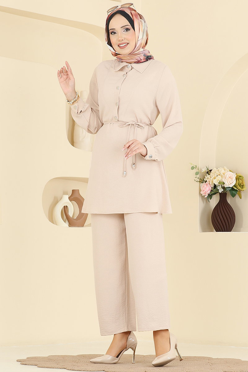 Ürün Özelliği : Yeni sezon tesettür moda ürünüdür. Ürün Gömlek yakadır. Ürün Önden kullanılabilir yarım düğmelidir. Astarsızdır. Üründe kemer köprüsü bulunmamaktadır. Kemer ürüne dahildir, isteğe bağlı kullanılmayabilir. Pantolon beli lastiklidir. Manşet düğmeleri aktiftir.Konsept fotoğraf çekimlerinden dolayı üründe ton farklılığı olabilir.