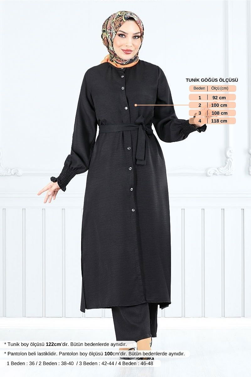 Ürün Özelliği : Yeni sezon tesettür moda ürünüdür. Ürün Hakim yakadır. Ürün Önden düğmelidir. Tunik yandan yırtmaçlıdır.. Astarsızdır. Kemer ürüne dahildir, isteğe bağlı kullanılmayabilir. Pantolon beli lastiklidir. Manşet lastiklidir. Konsept fotoğraf çekimlerinden dolayı üründe ton farklılığı olabilir.