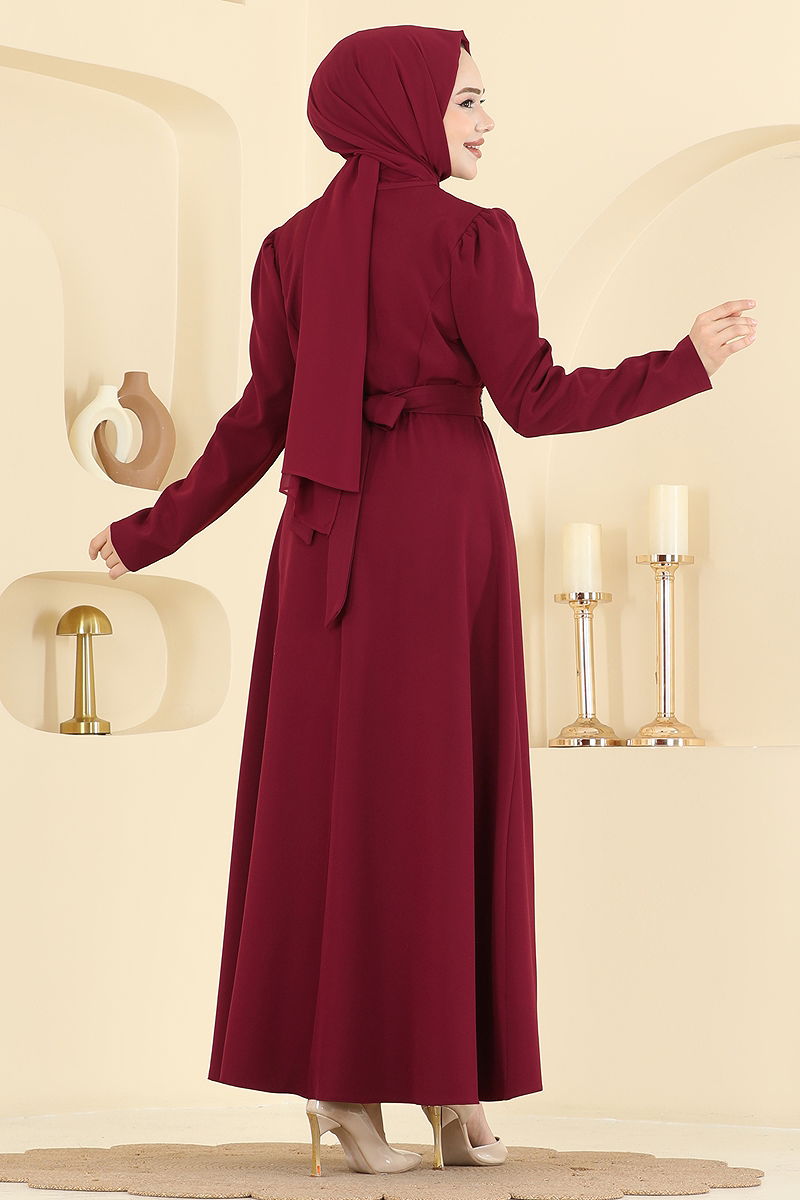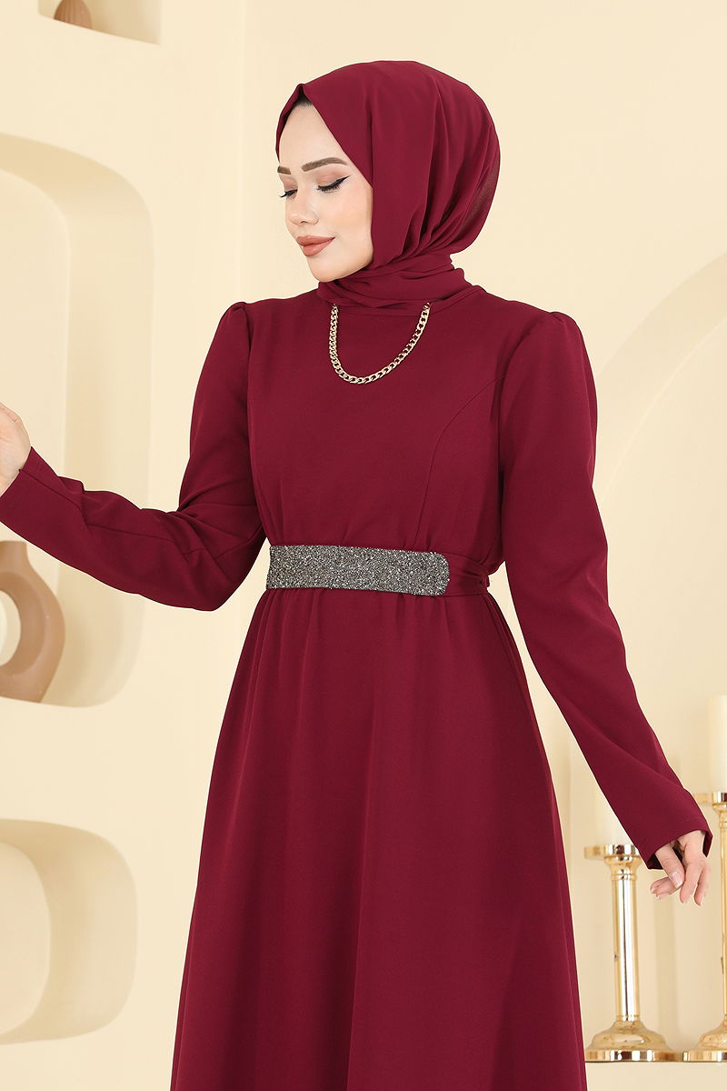 Kemeri Işıltılı Dabıl Elbise Bordo