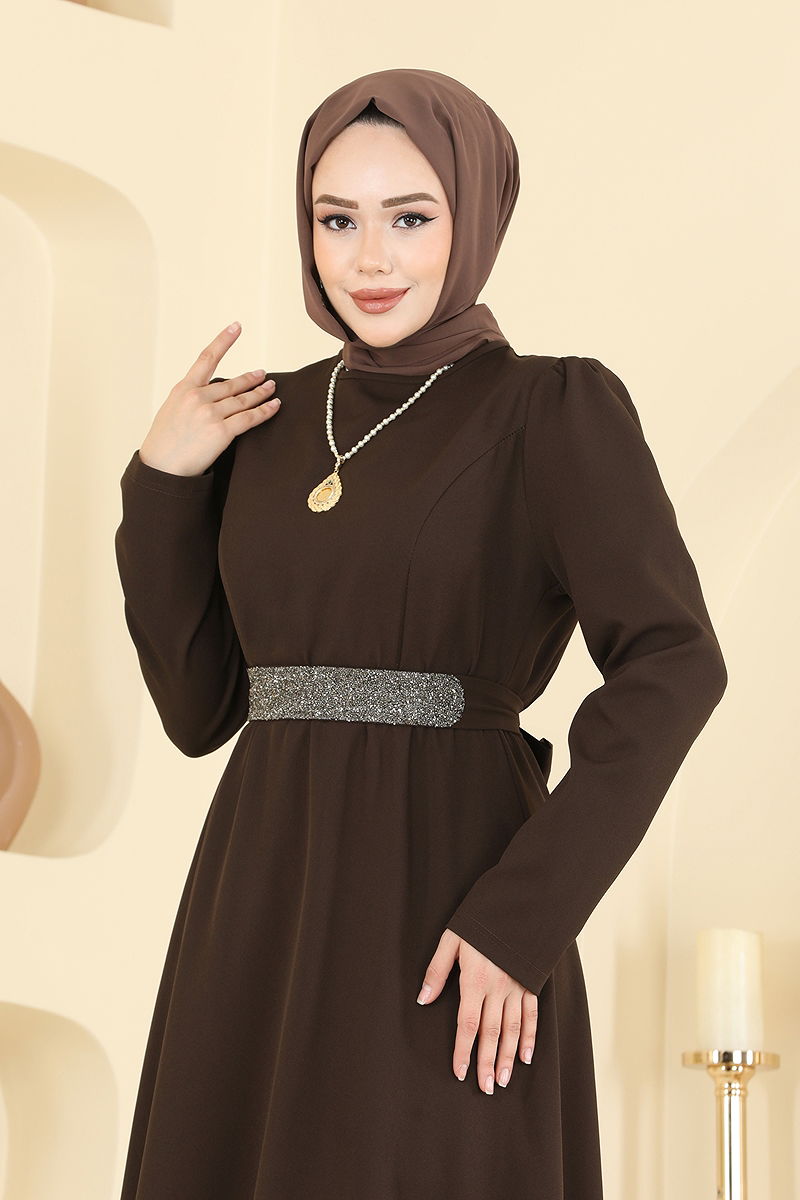 Kemeri Işıltılı Dabıl Elbise 2788SL432 Koyu Kahve