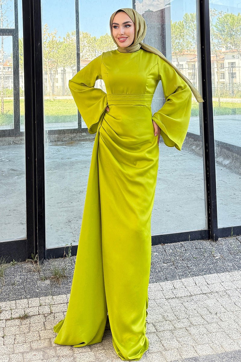 Kemeri Pelerinli Saten Abiye Yağ Yeşili