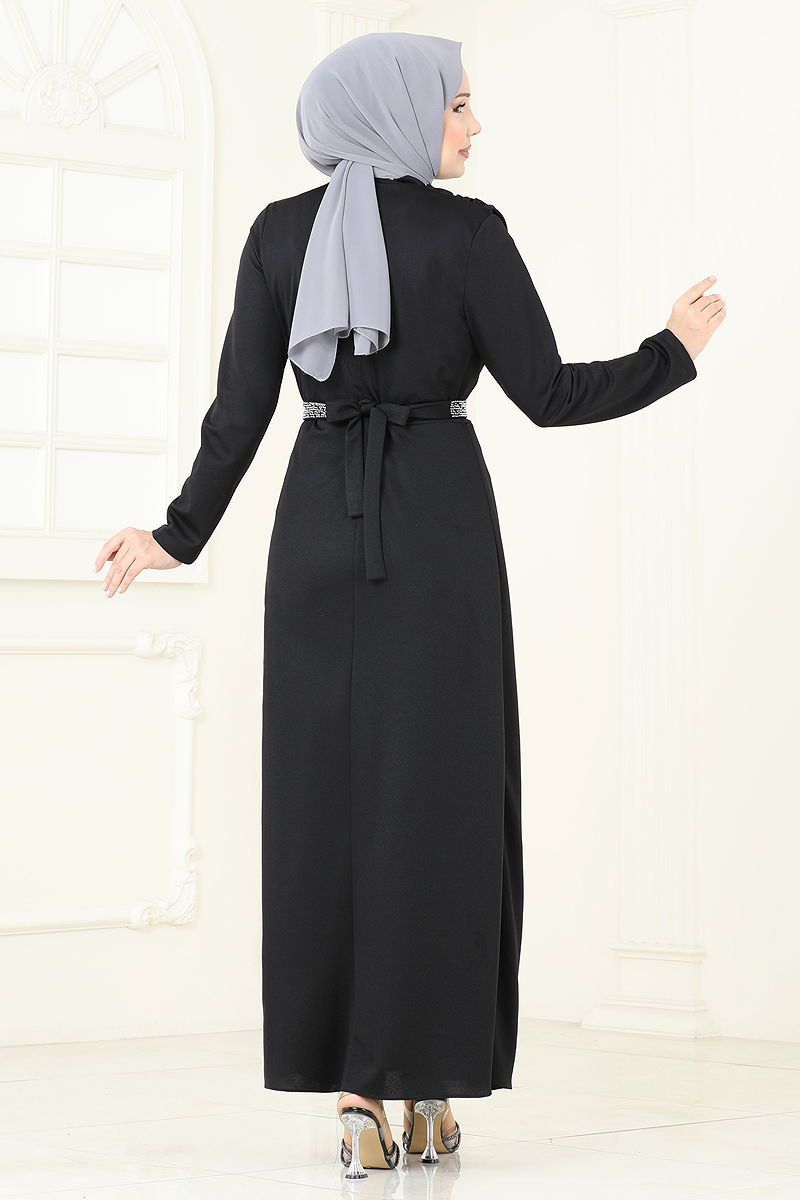 Kemeri Taşlı Abiye Elbise Siyah