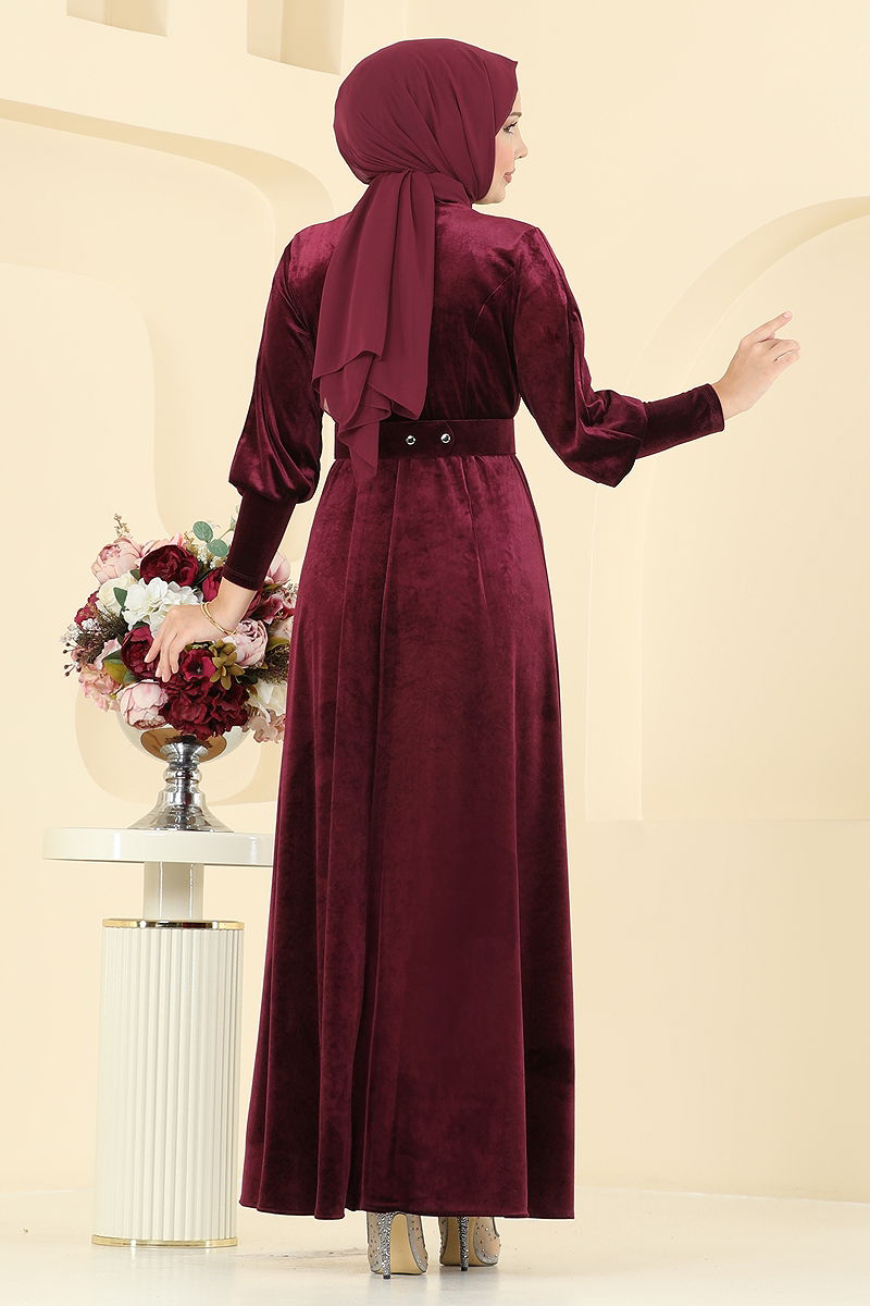 Kemeri Taşlı Kadife Elbise 2414MEY846 Bordo