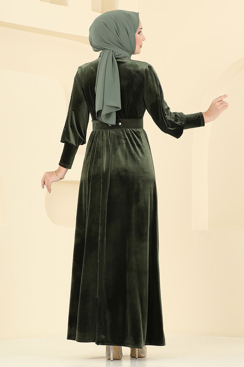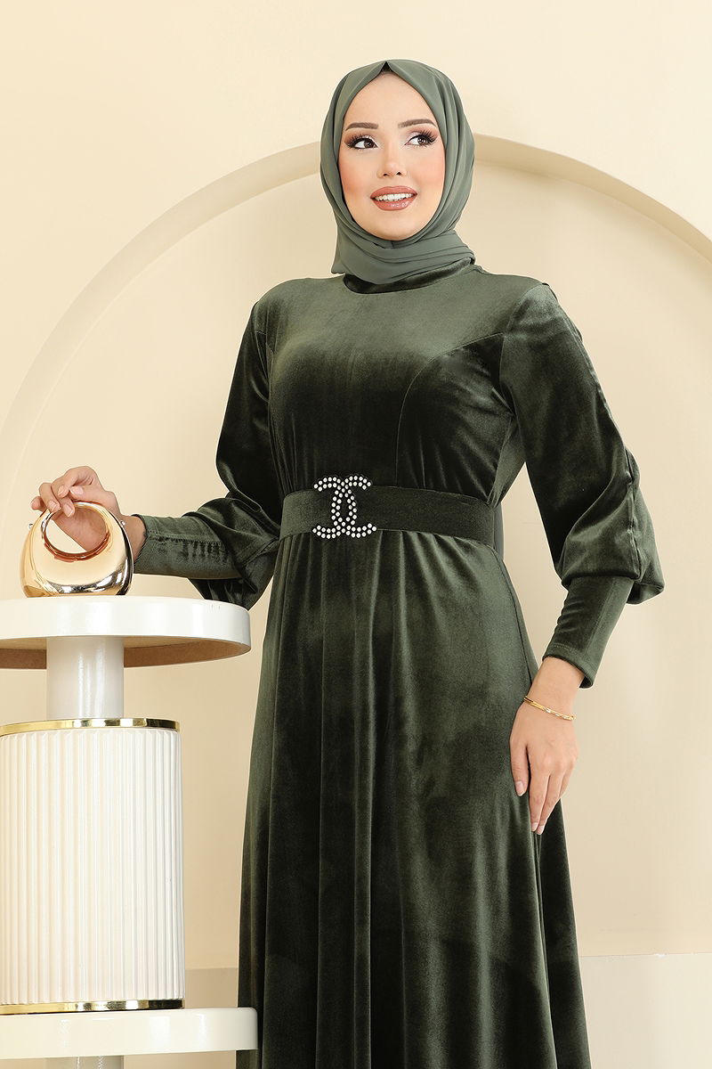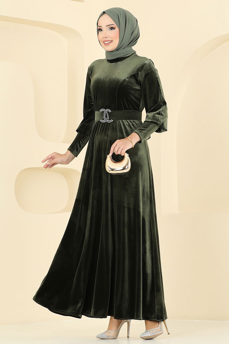 Kemeri Taşlı Kadife Elbise 2414MEY846 Haki
