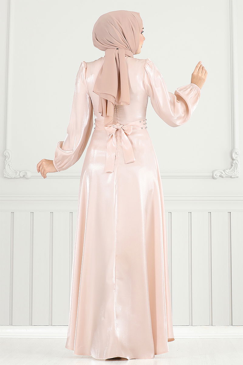 Kemeri Taşlı Tesettür Abiye Pudra
