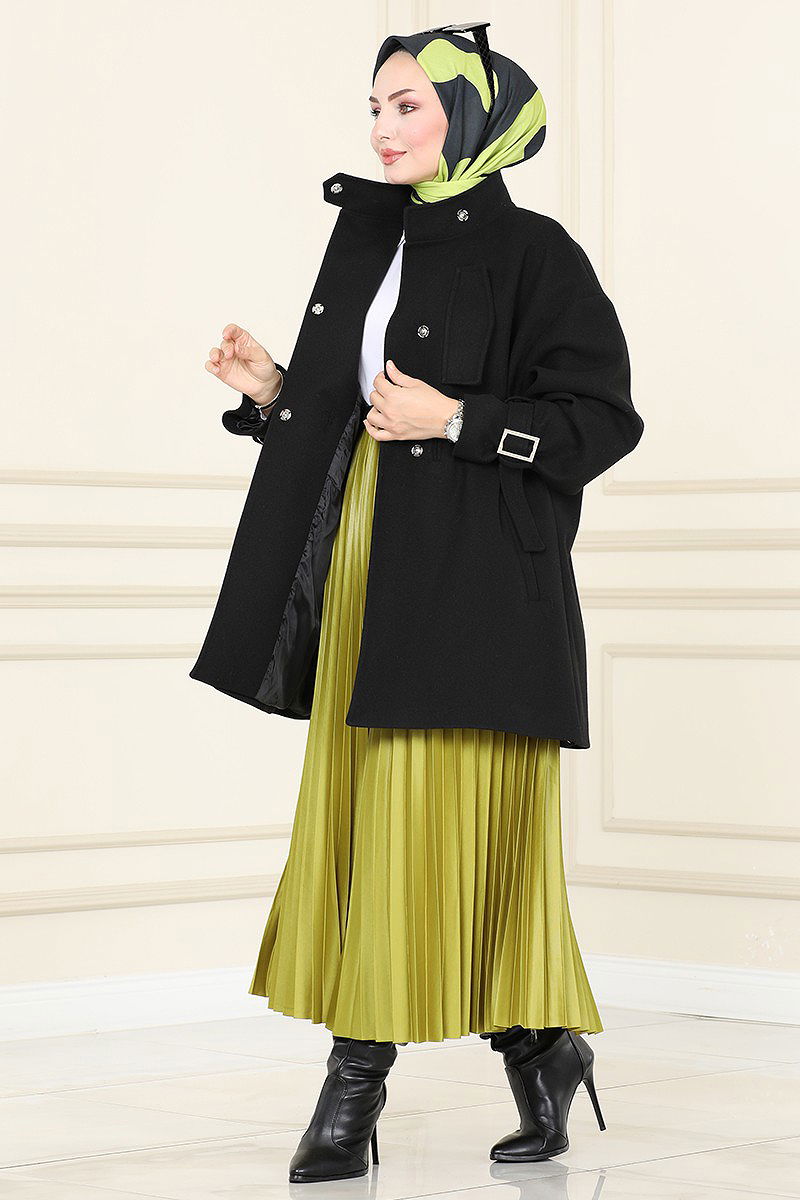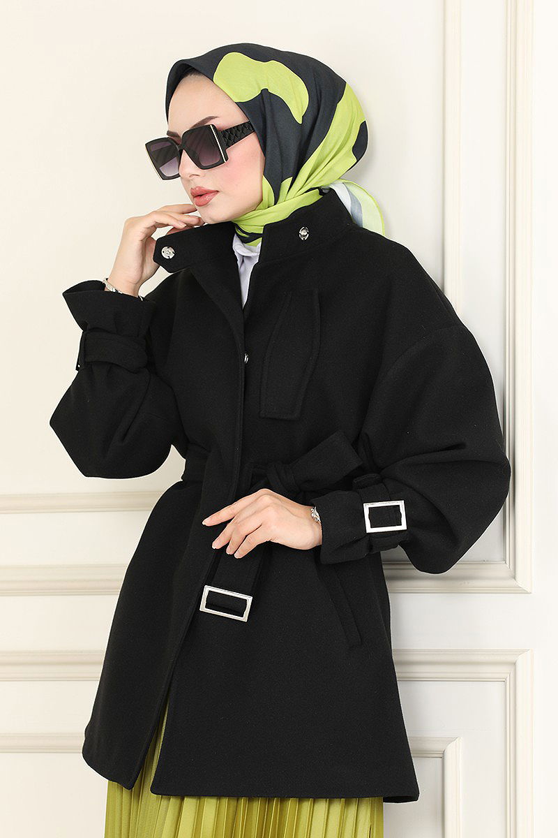 Kemerli İthal Kaşe Kaban Siyah