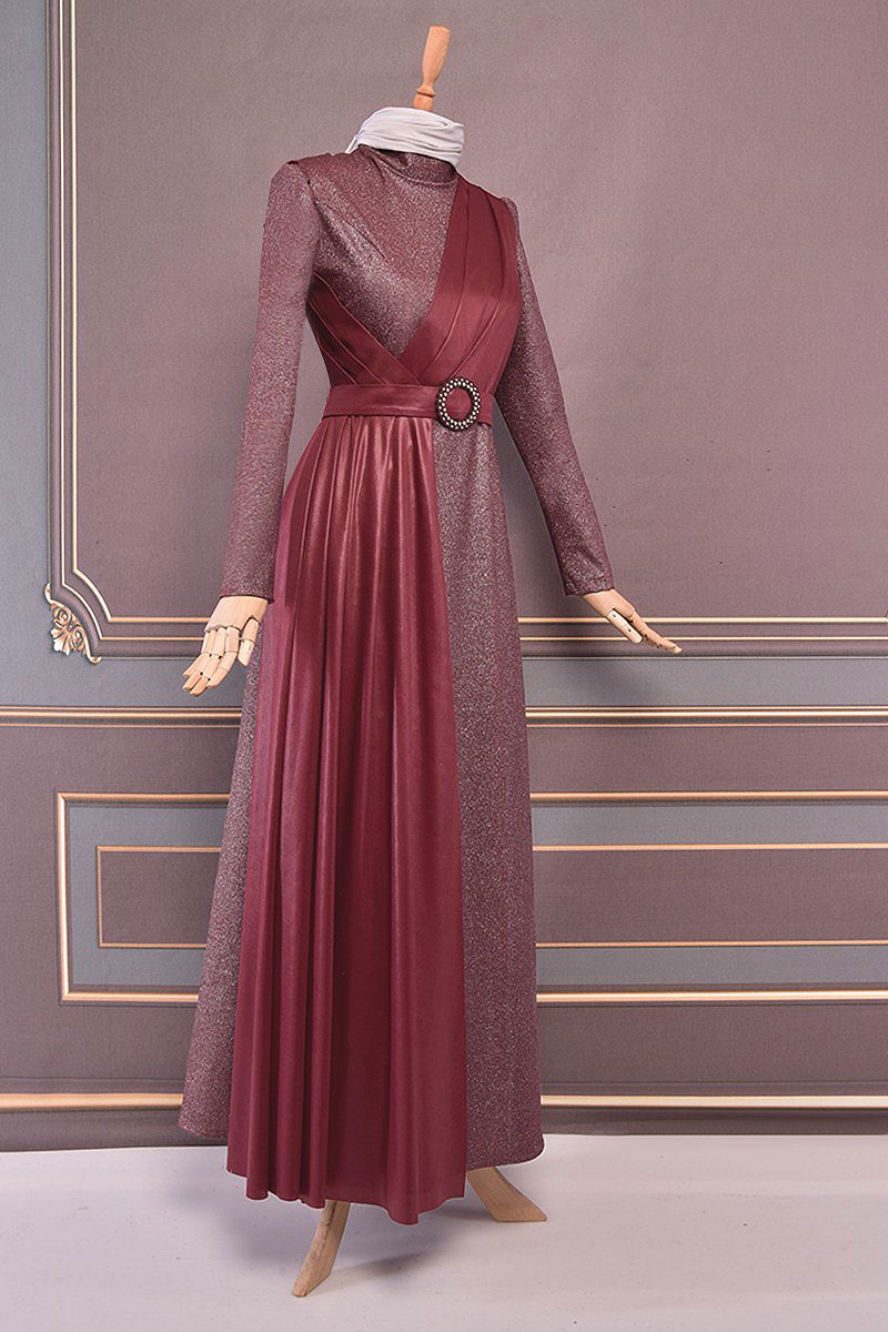 Belted Silvery Evening Dress Burgundy