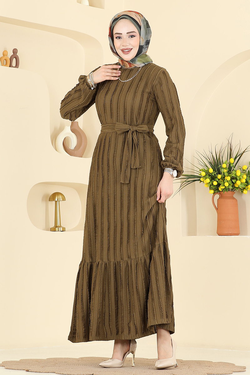 Klasik Çizgili Uzun Elbise 726PM271 Yağ Yeşili
