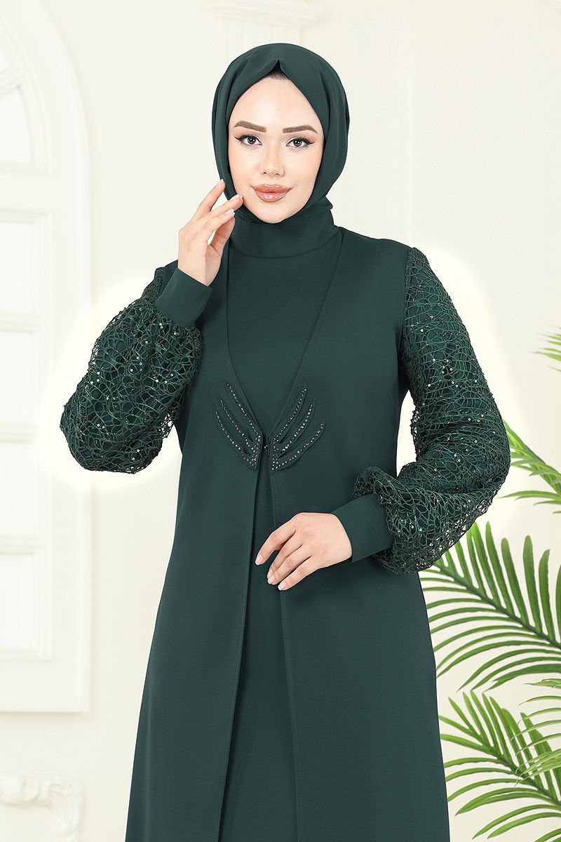 Kolları Fileli Abiye Elbise Zümrüt