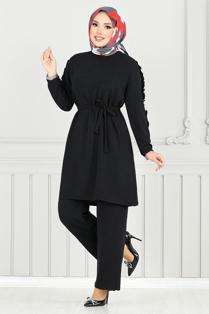 Kolları Fırfırlı Aerobin Takım KOMBİN modelimiz, dört mevsim konforunuz düşünülerek tasarlanmıştır. 30 derecede hassas yıkama ile temizlenebilen bu tesettür ürün, hafif aerobin kumaşı sayesinde gün boyu rahatlık sunar. Bisiklet yaka ve astarsız tasarımı ile şıklığına şıklık katan bu takım, kafadan giyim kolaylığı sağlar. Kemerin dalgalanmaması için özel olarak dikilmiş iki ucu ile pratik bir kullanım sunar. Pantolonun beli ve tuniğin manşetleri lastikli olduğundan mükemmel bir uyum sağlar. Estetik ve konforu bir arada sunan bu kombinle günün her anı rahat ve şık geçsin.