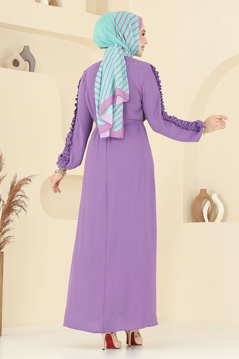 Zarif ve şık tasarımı ile dört mevsim rahatlıkla kullanabileceğiniz Kolları Fırfırlı Tesettür Elbise, her ortamda dikkat çekmenizi sağlar. Aerobin kumaşı sayesinde hafif ve nefes alabilen bu elbise, hassas yıkama ile 30 derecede yıkanabilir. Bisiklet yakası ve manşetleri lastikli olup, astarsızdır. Ürünün arka kısmında kullanım kolaylığı için bir düğme yer almakta, ayrıca dalgalanmayı önleyen özel dikilmiş kemer ile birlikte gelmektedir. Kemer isteğe bağlı olarak çıkarılabilir.