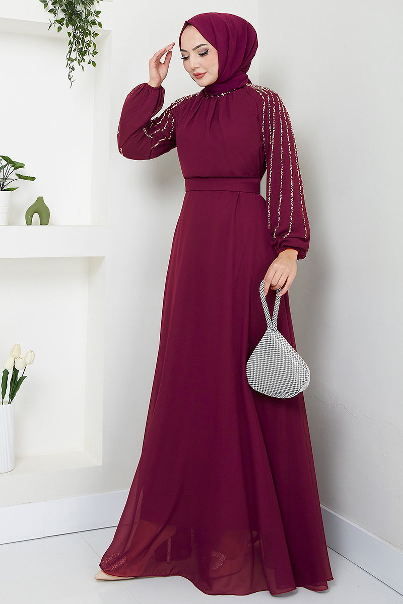 Kolları İşlemeli Abiye Mürdüm