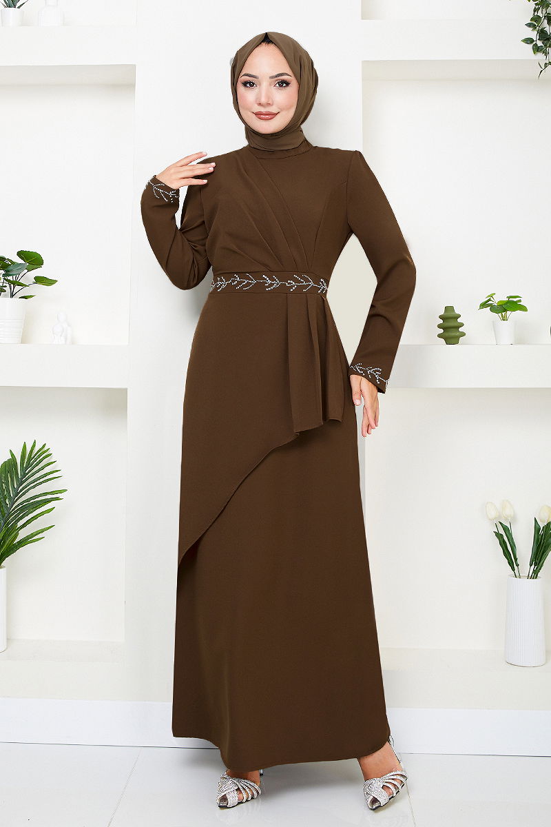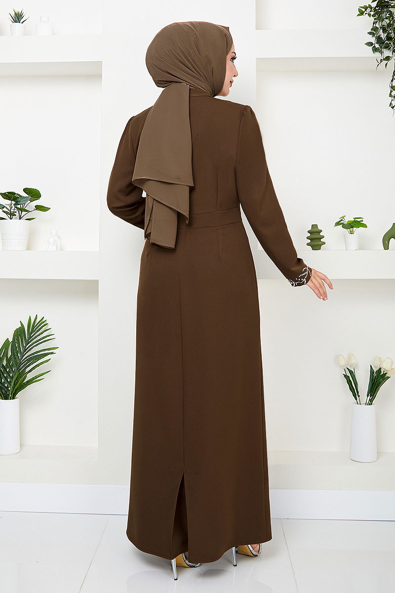 Kolları İşlemeli Tesettür Abiye 4047KTR927-M Kahve