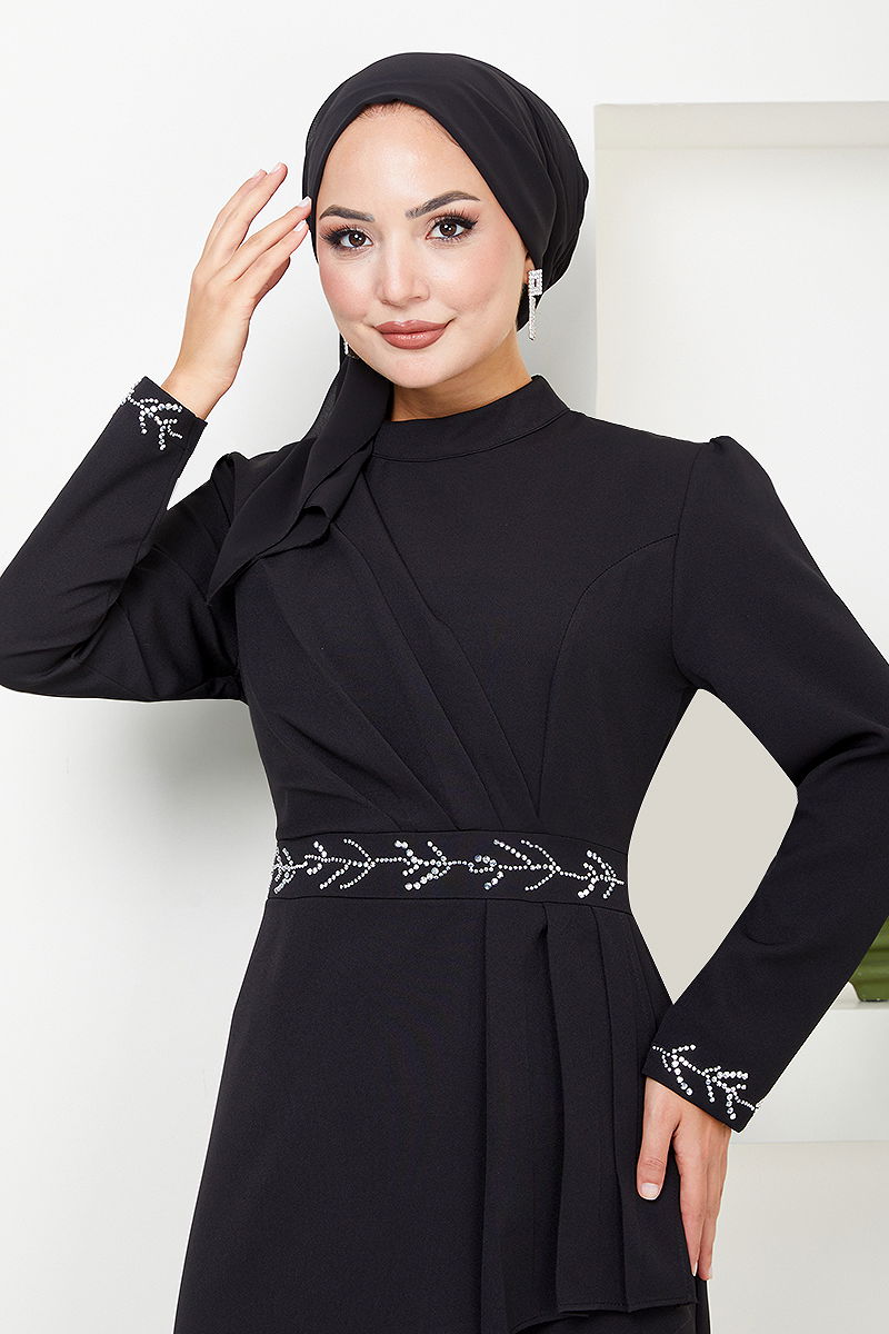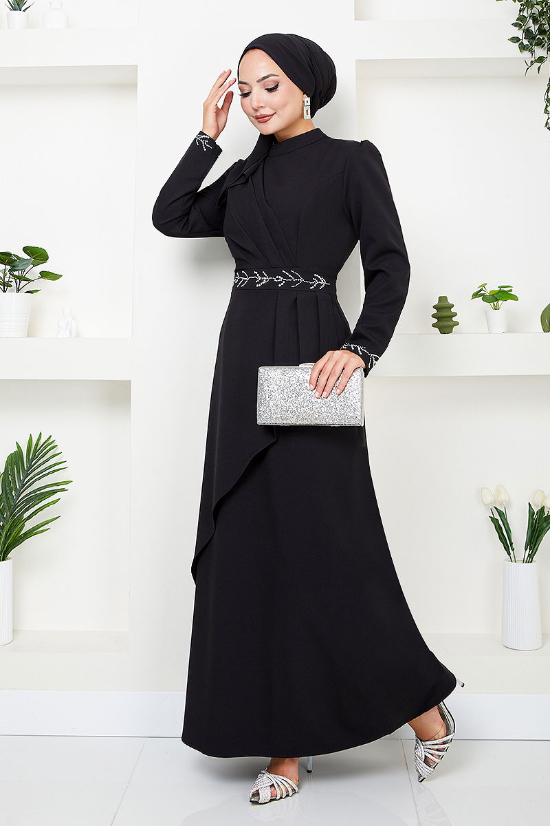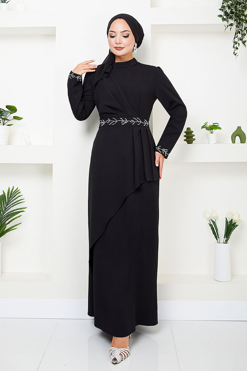Kolları İşlemeli Tesettür Abiye 4047KTR927-M Siyah