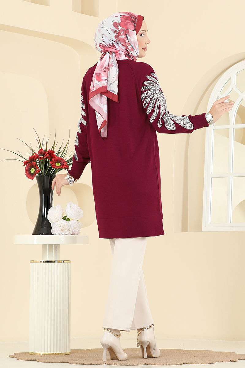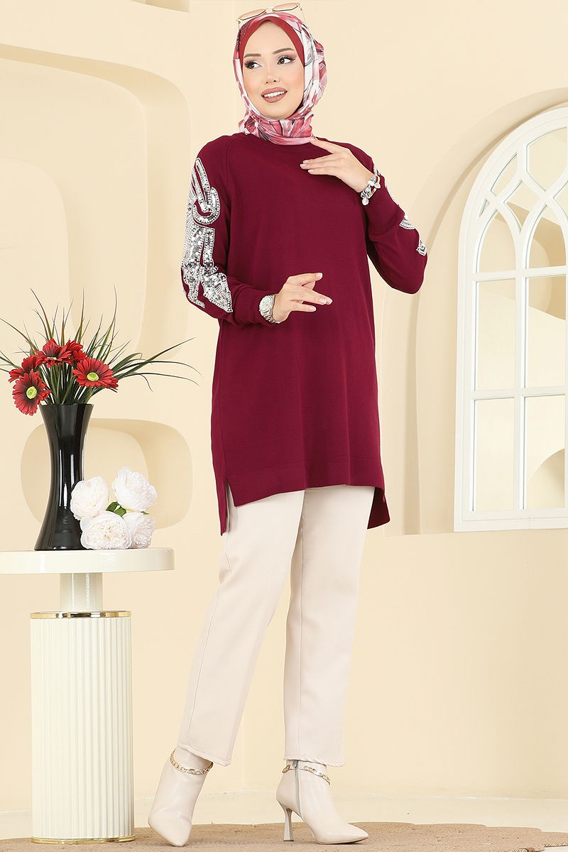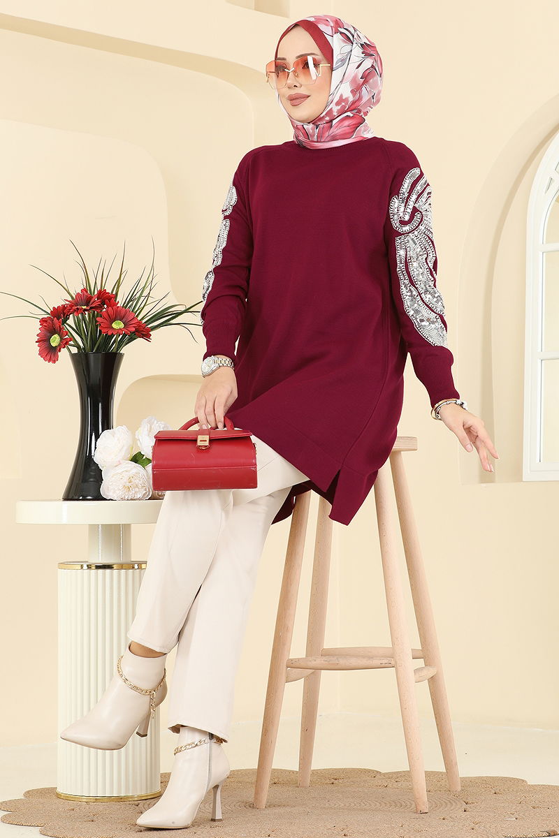Kolları İşlemeli Triko Tunik 2494UZ662 Bordo